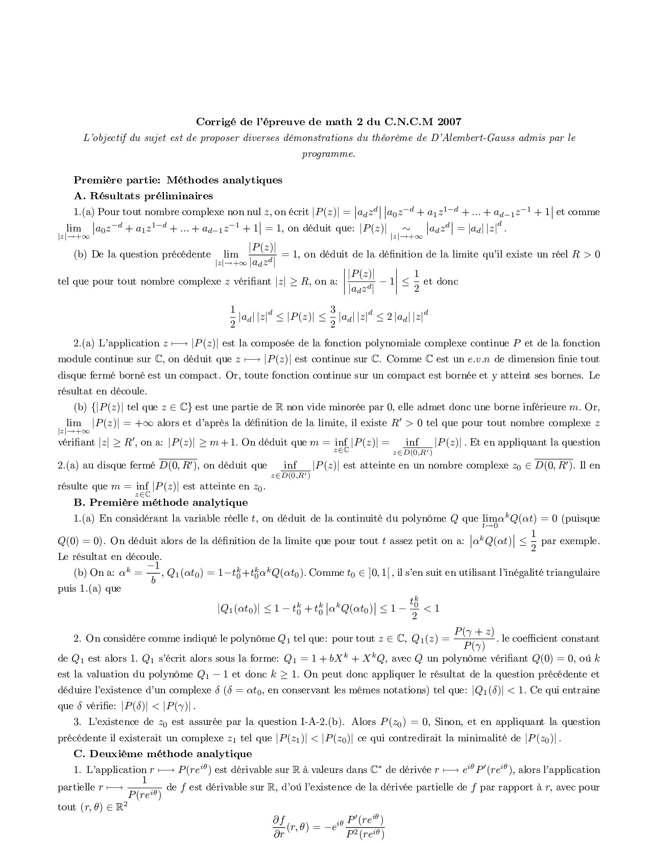 CNC MP 2007 Maths 2 Corrigé
