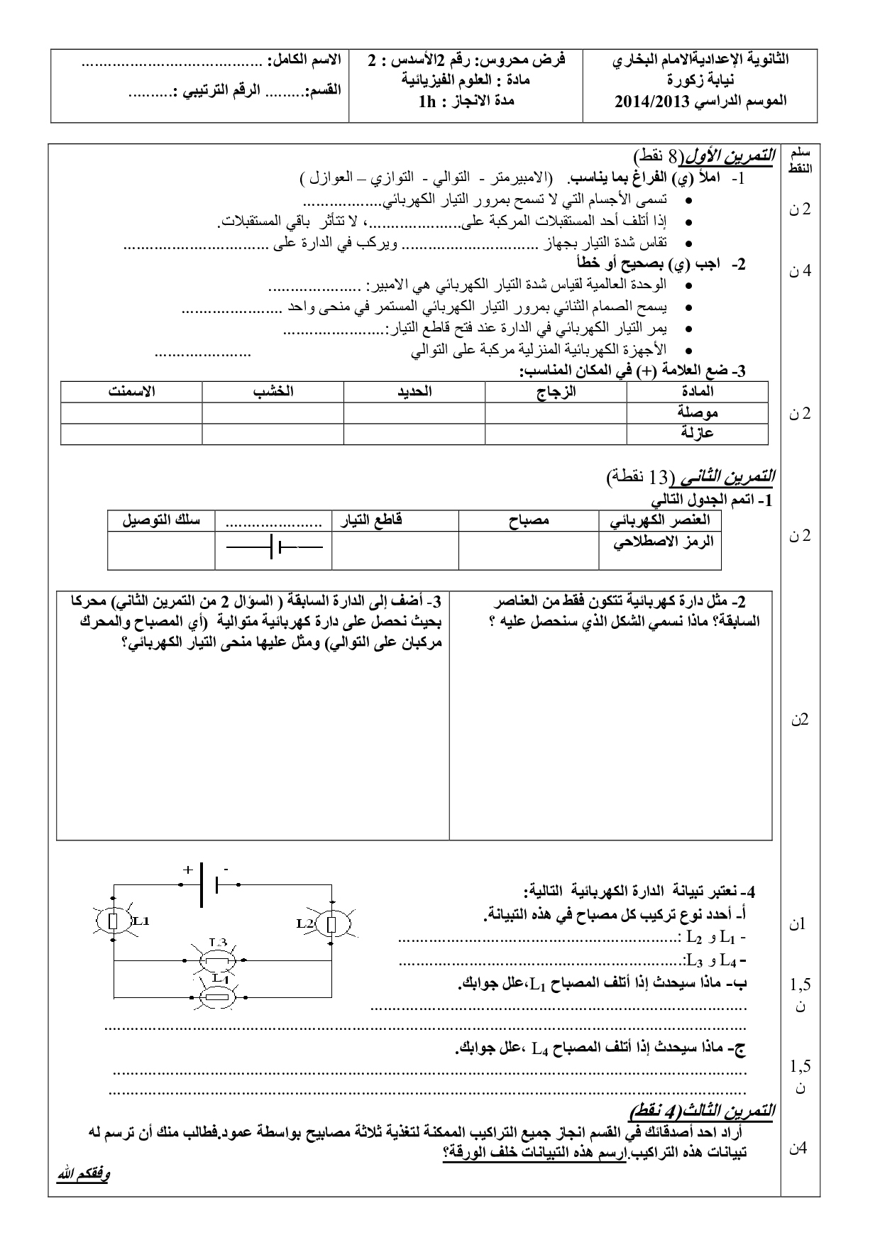 الفرض 1 نموذج 11 - الفيزياء والكيمياء أولى إعدادي الدورة الثانية