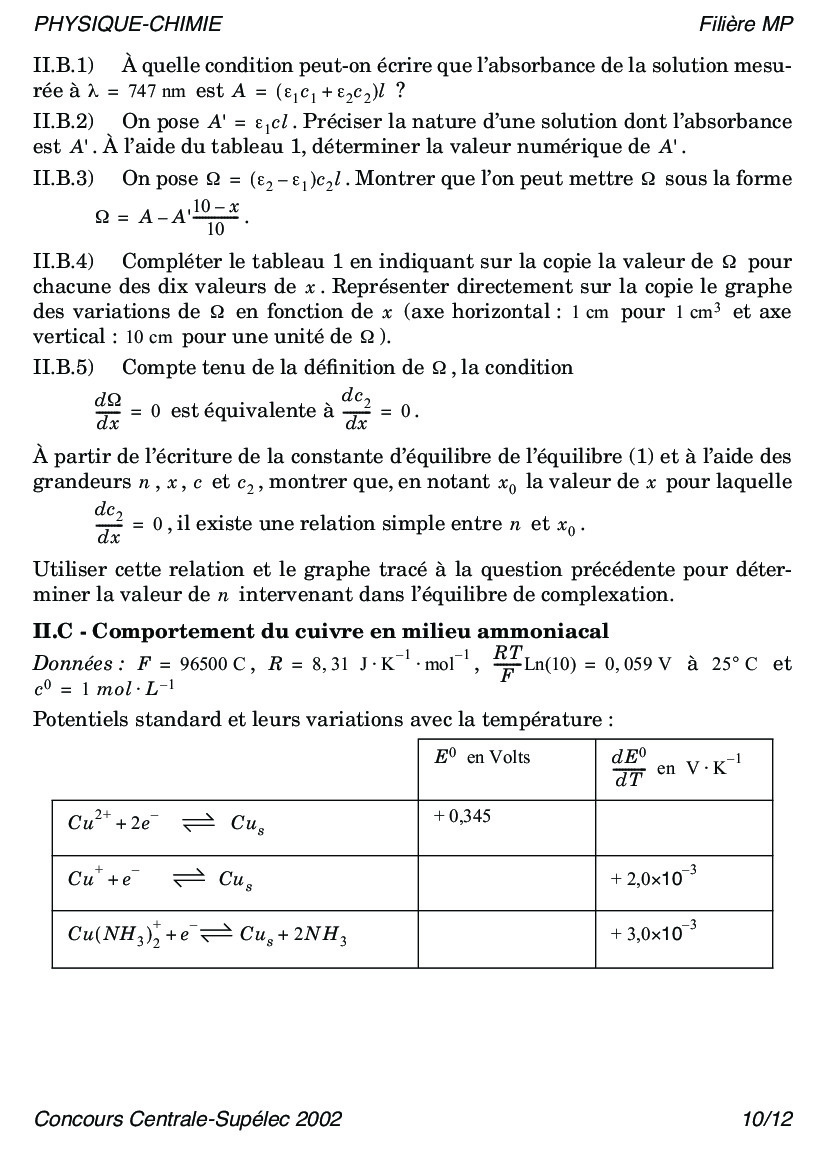 Centrale-Supelec MP 2002 Physique-Chimie Epreuve