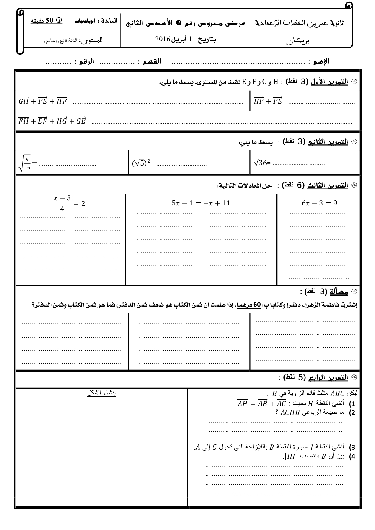 الفرض 2 نموذج 1 - الرياضيات ثانية إعدادي الدورة الثانية