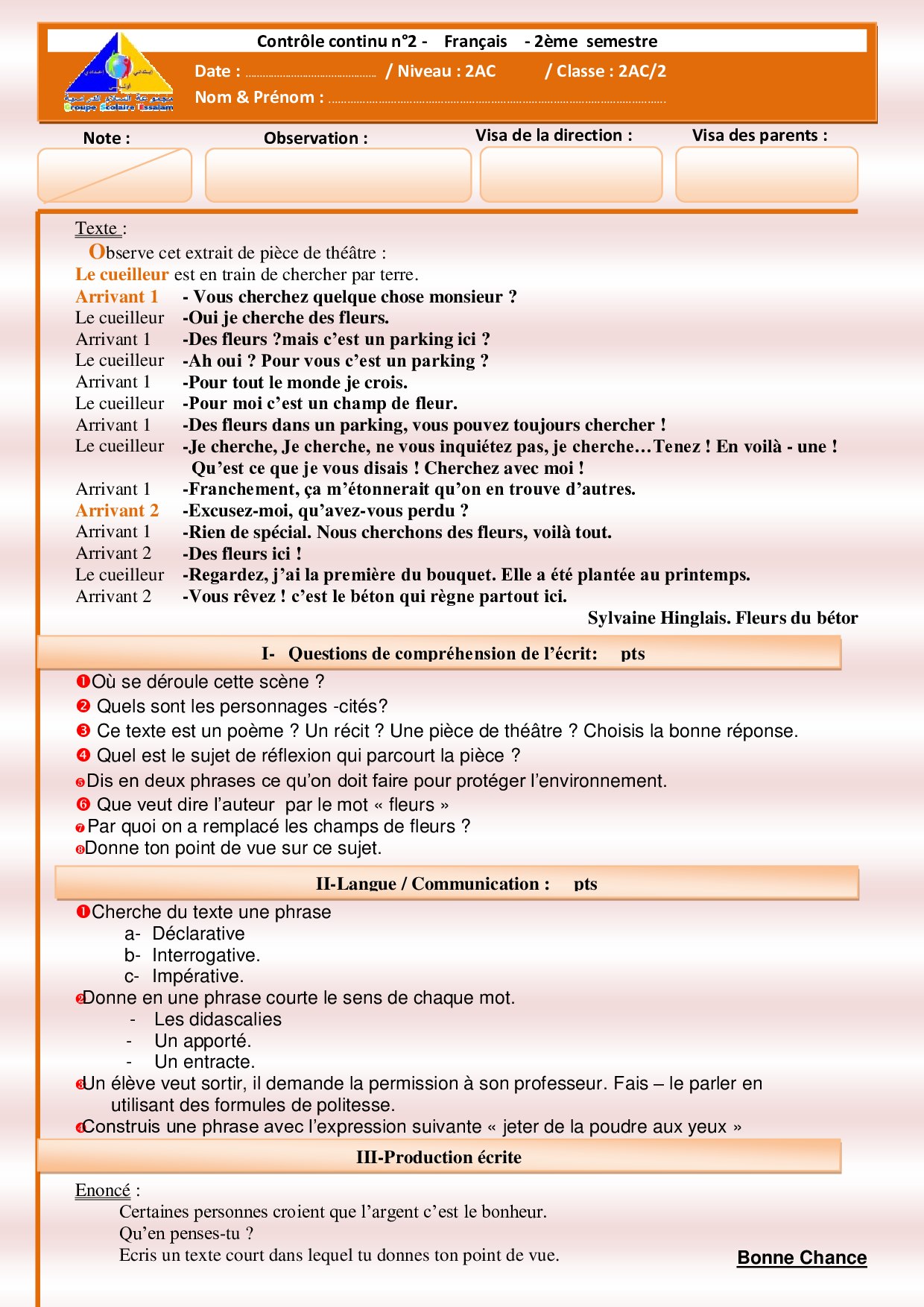 Devoir 2 Modèle 7 - Français 2AC Semestre 2