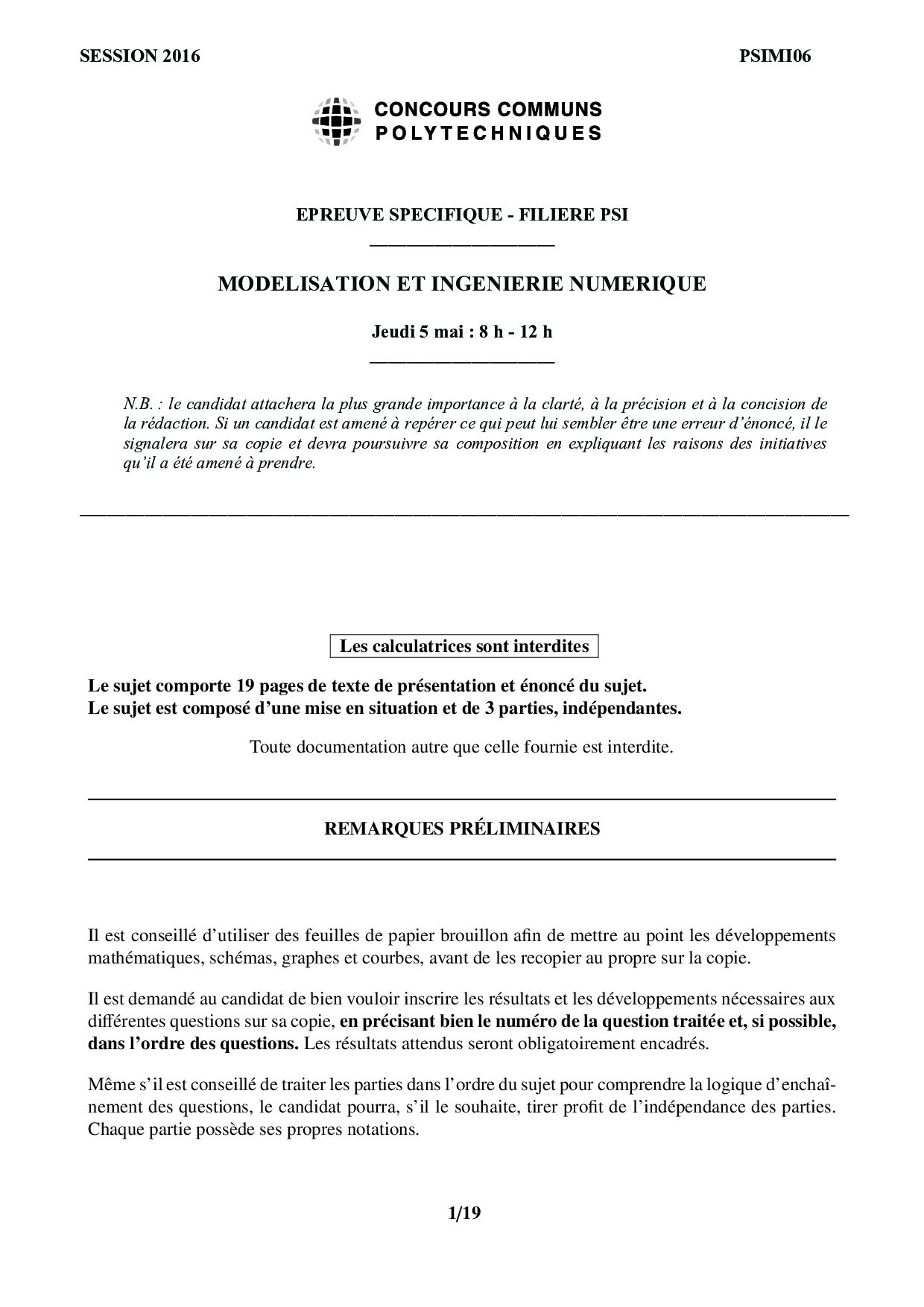 CCP 2016 PSI Modélisation et Ingénierie Numérique Epreuve