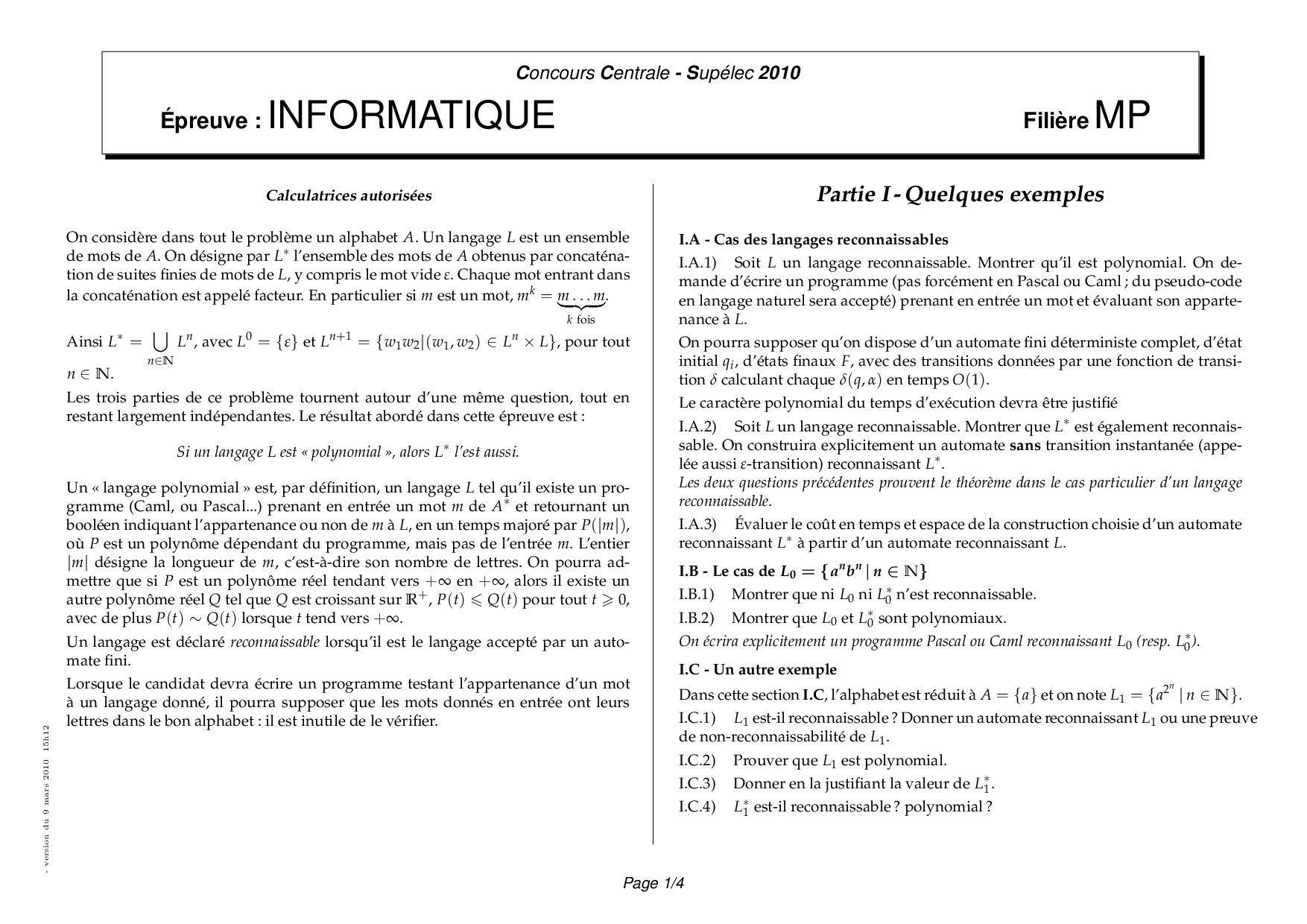 Centrale-Supelec MP 2010 Informatique Epreuve