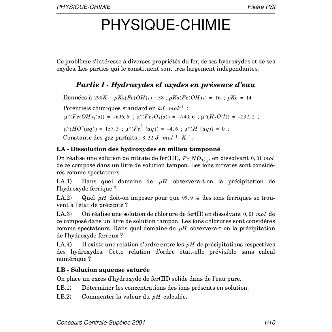 Centrale-Supelec PSI 2001 Physique-Chimie Epreuve
