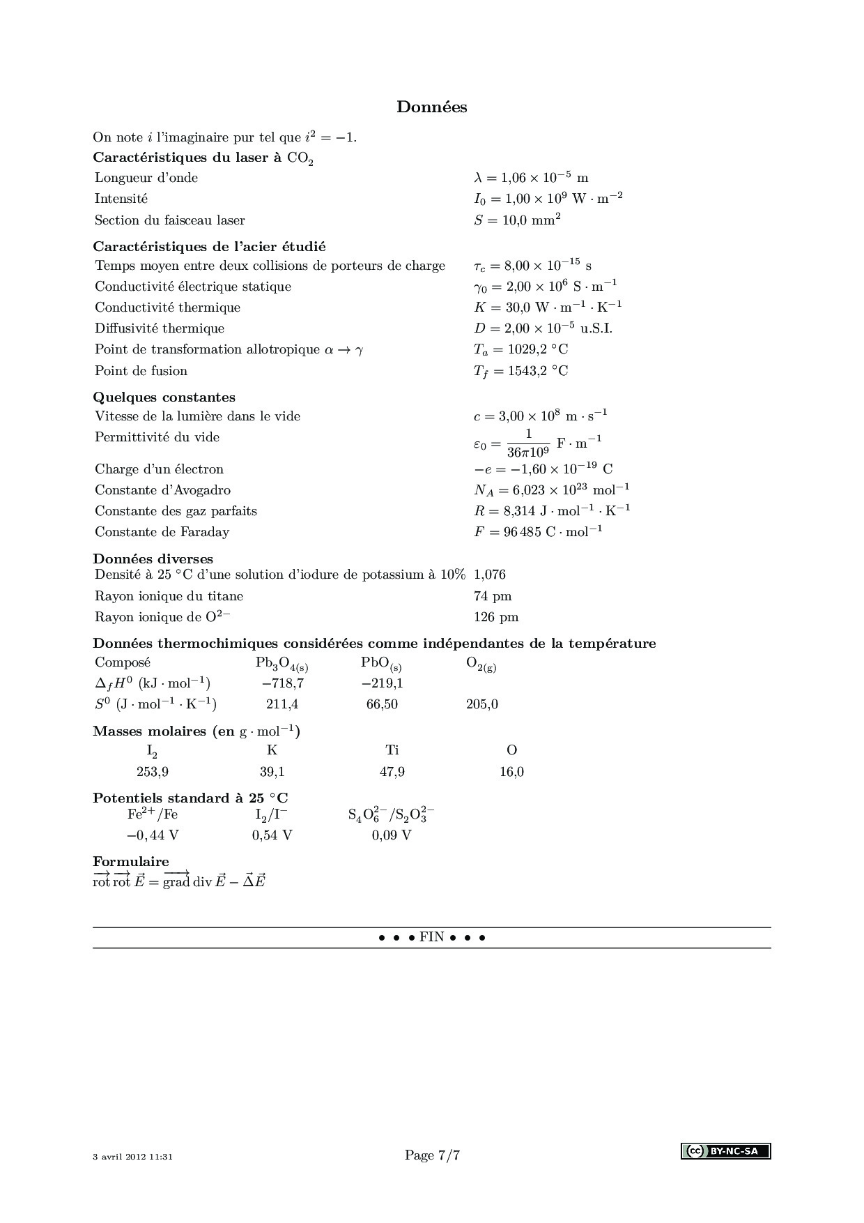 Centrale-Supelec PSI 2012 Physique-Chimie Epreuve