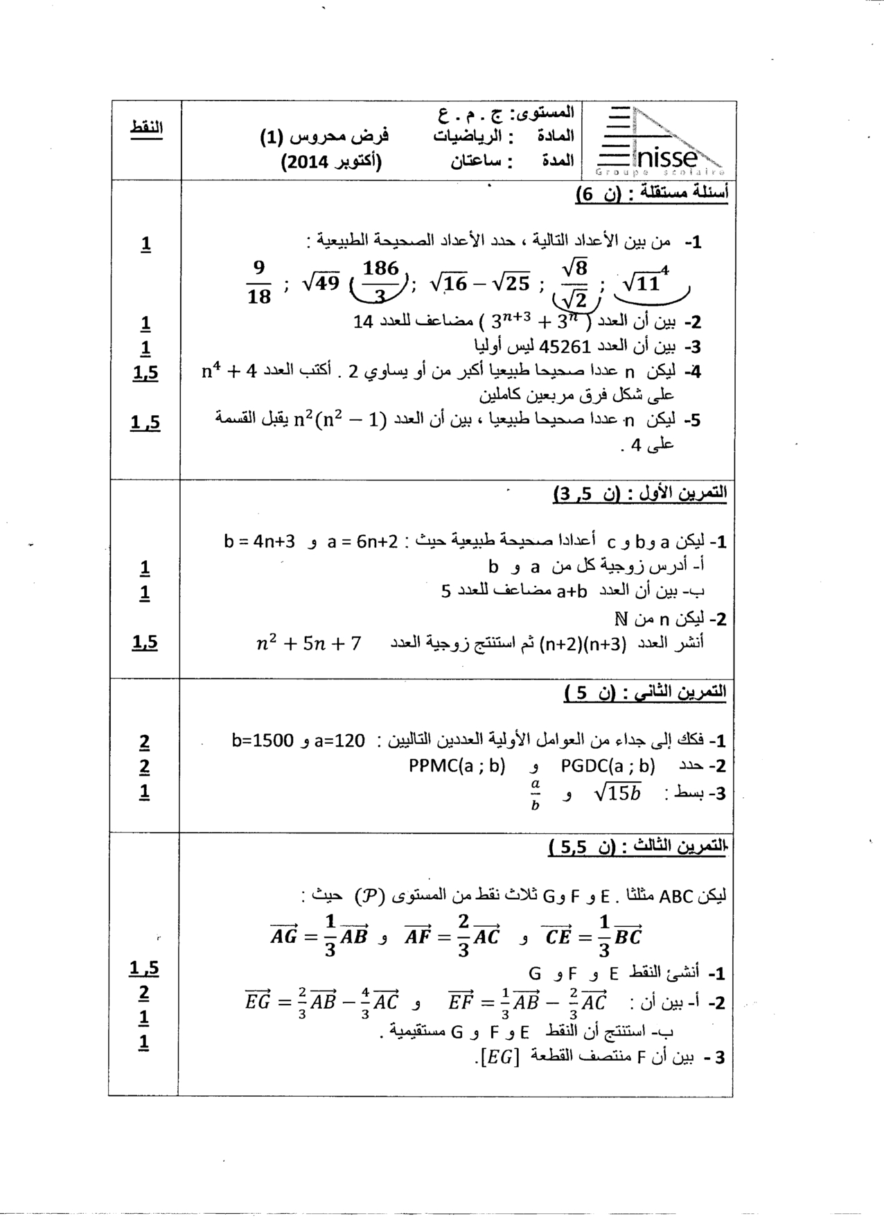 الفرض 1 نموذج 8 - الرياضيات جذع مشترك الدورة الأولى