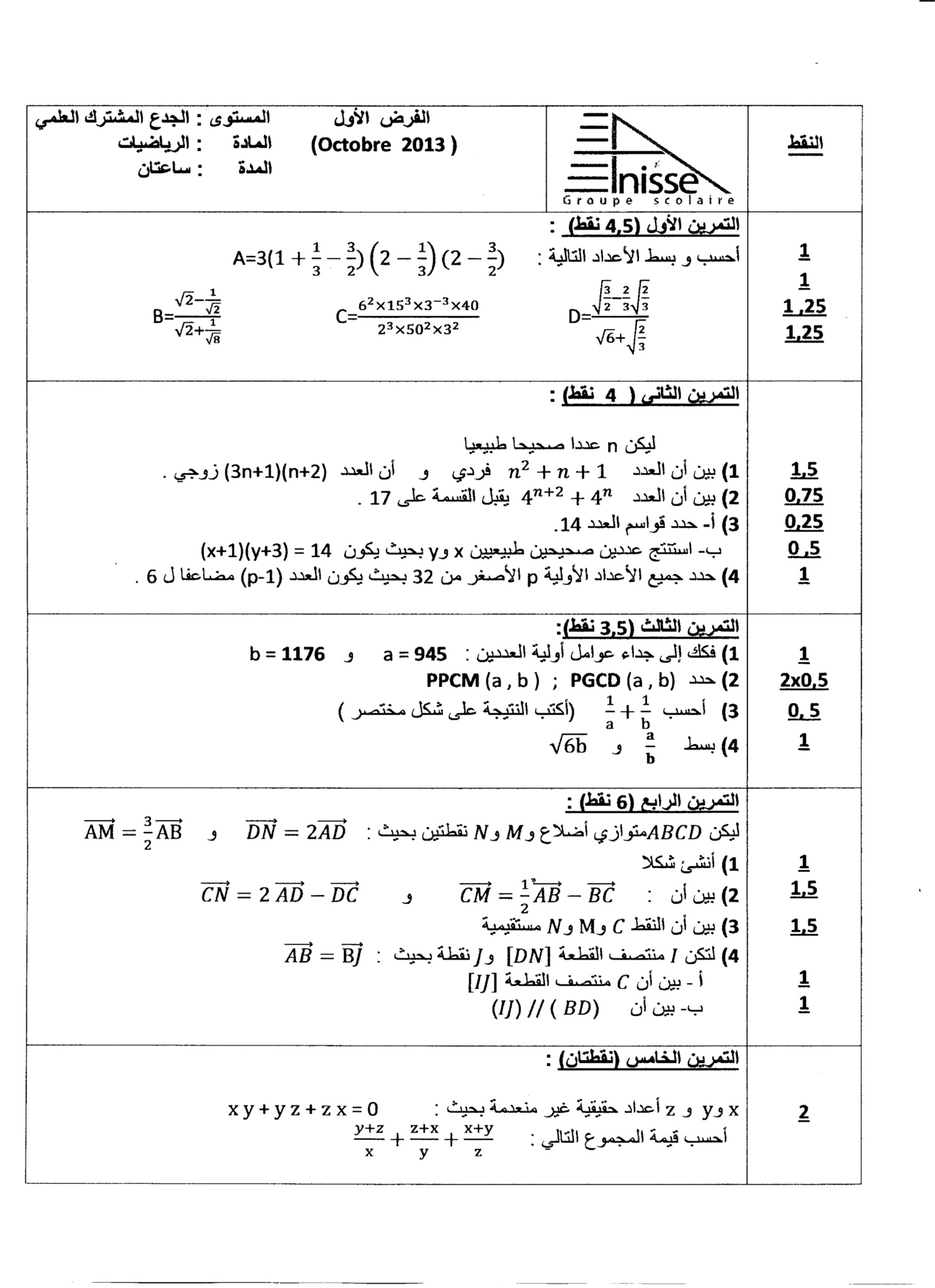 الفرض 1 نموذج 9 - الرياضيات جذع مشترك الدورة الأولى