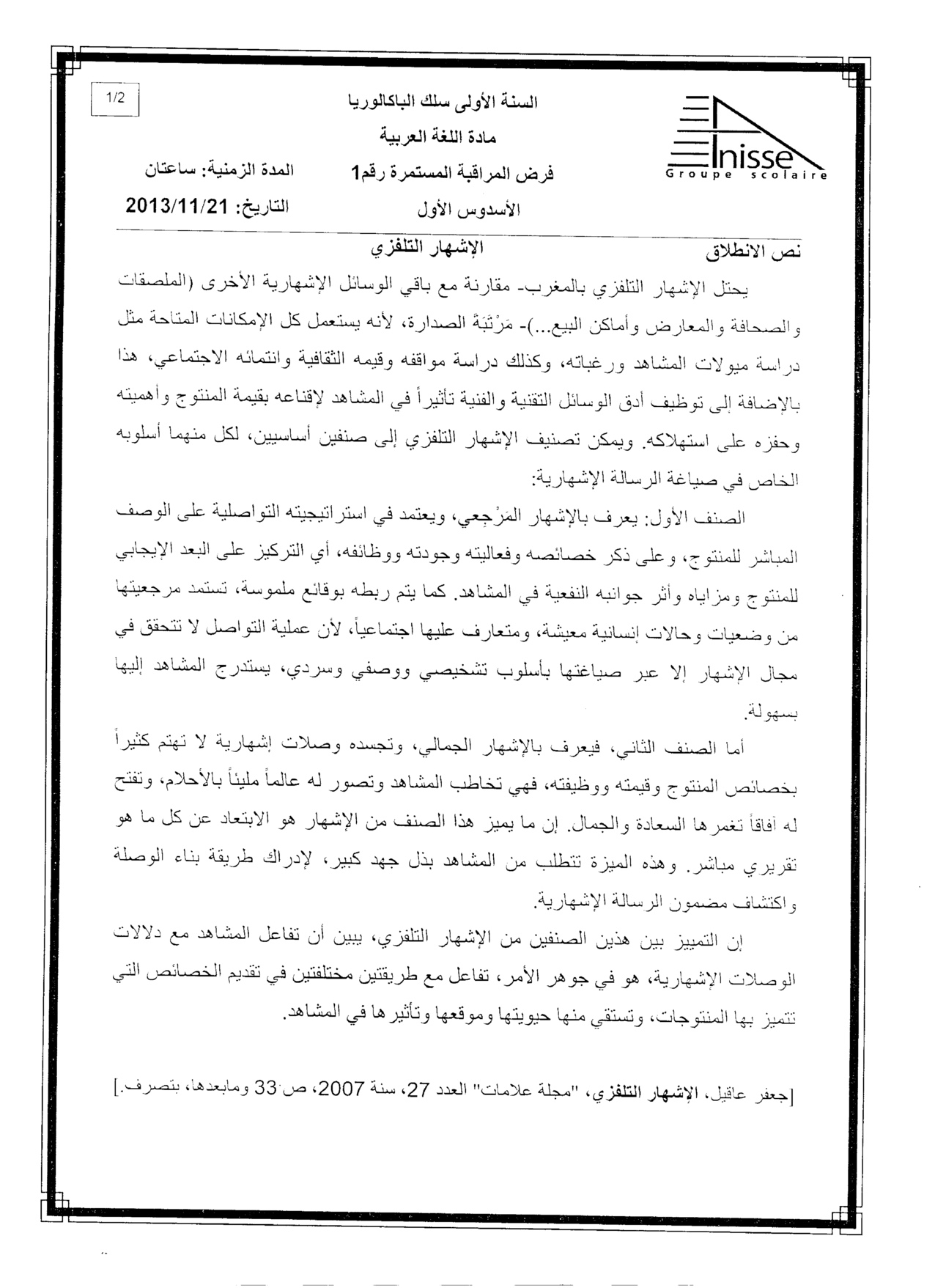 الفرض 1 نموذج 7 - اللغة العربية أولى باك الدورة الأولى