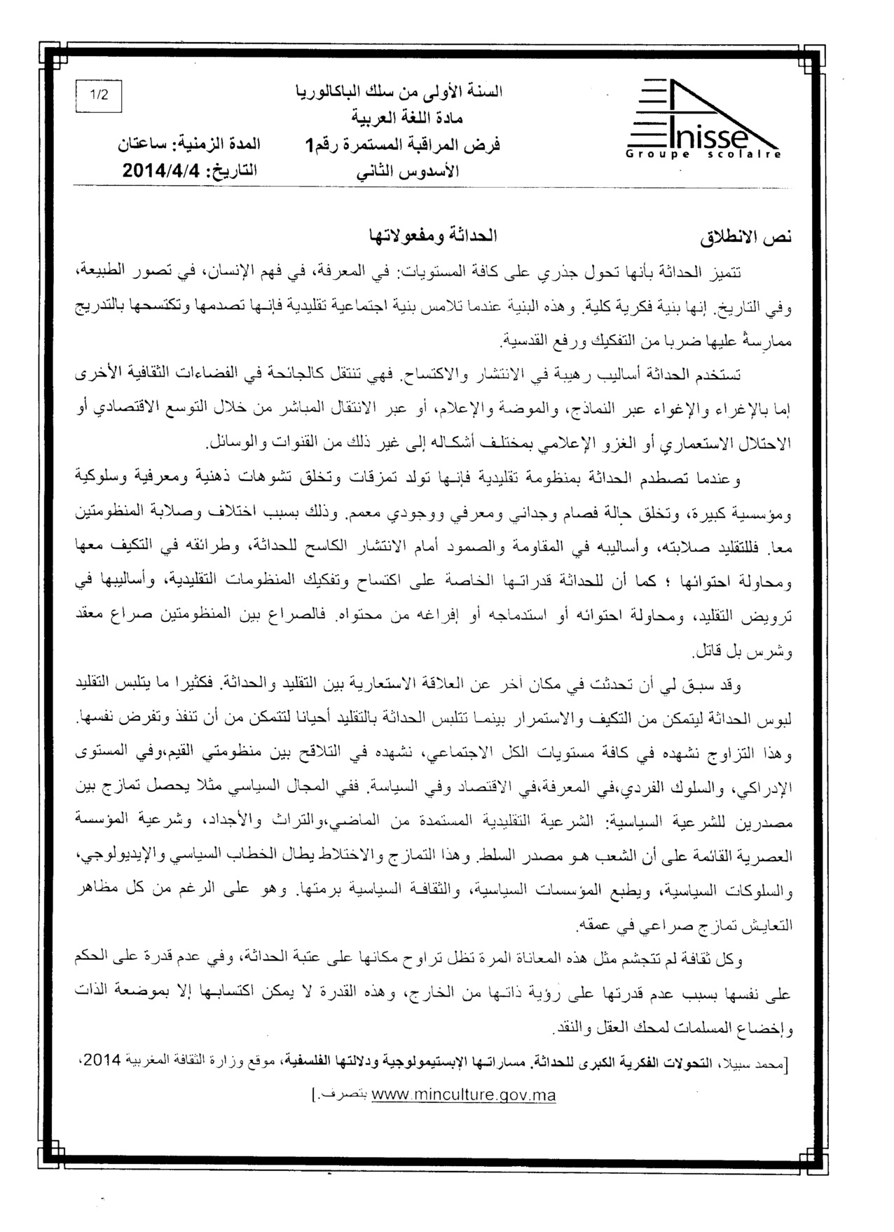 الفرض 1 نموذج 6 - اللغة العربية أولى باك الدورة الثانية