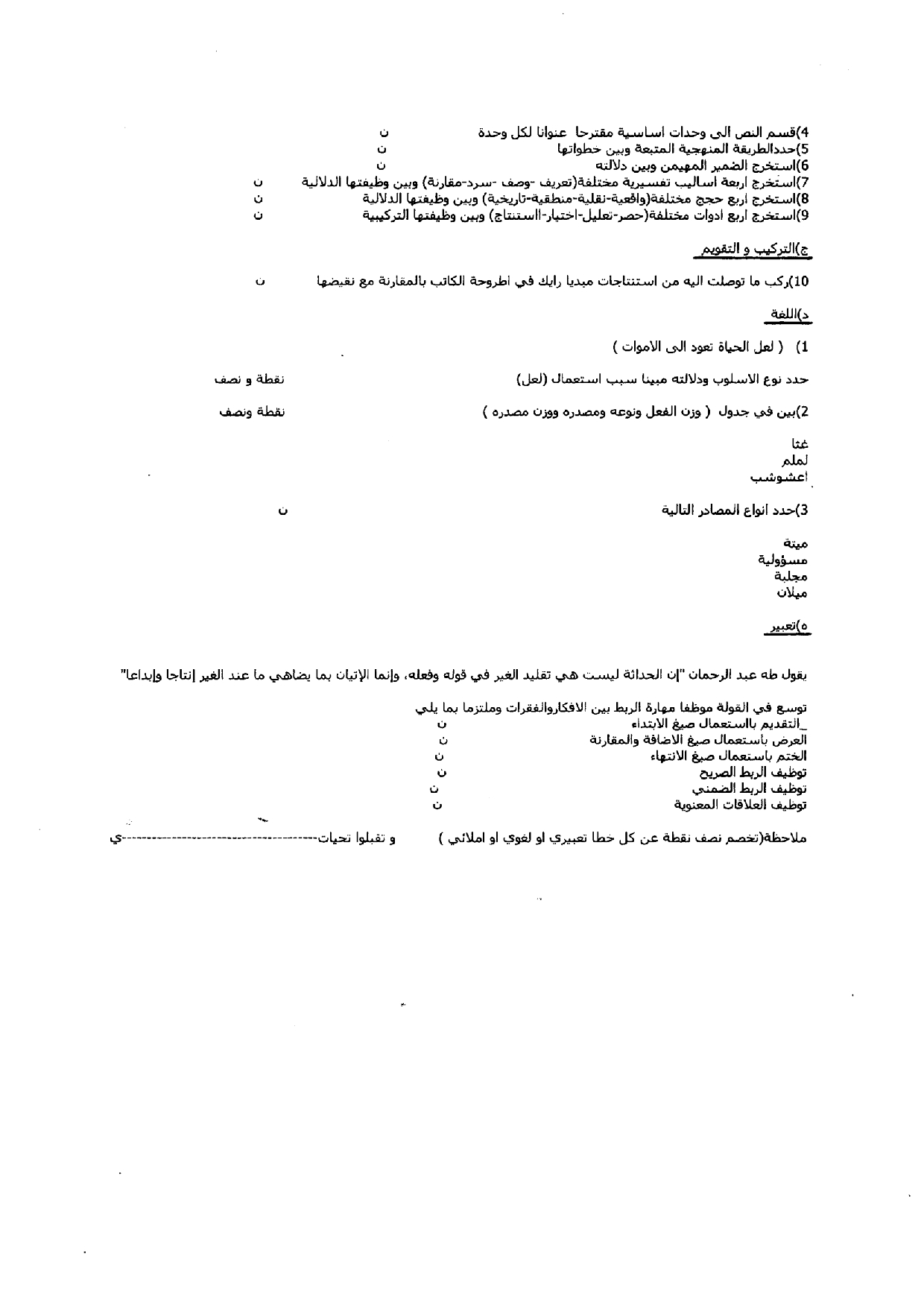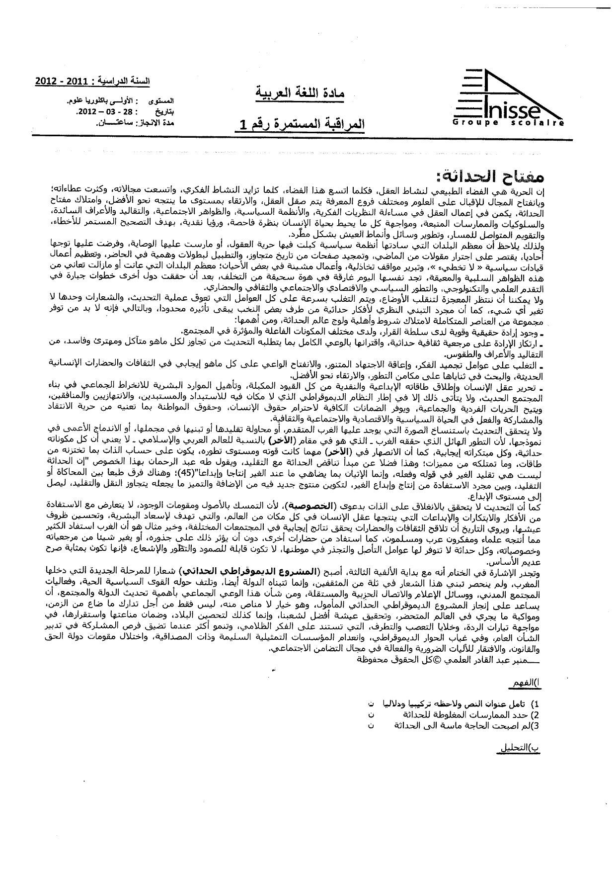 اللغة العربية: الأولى باكالوريا علوم رياضية