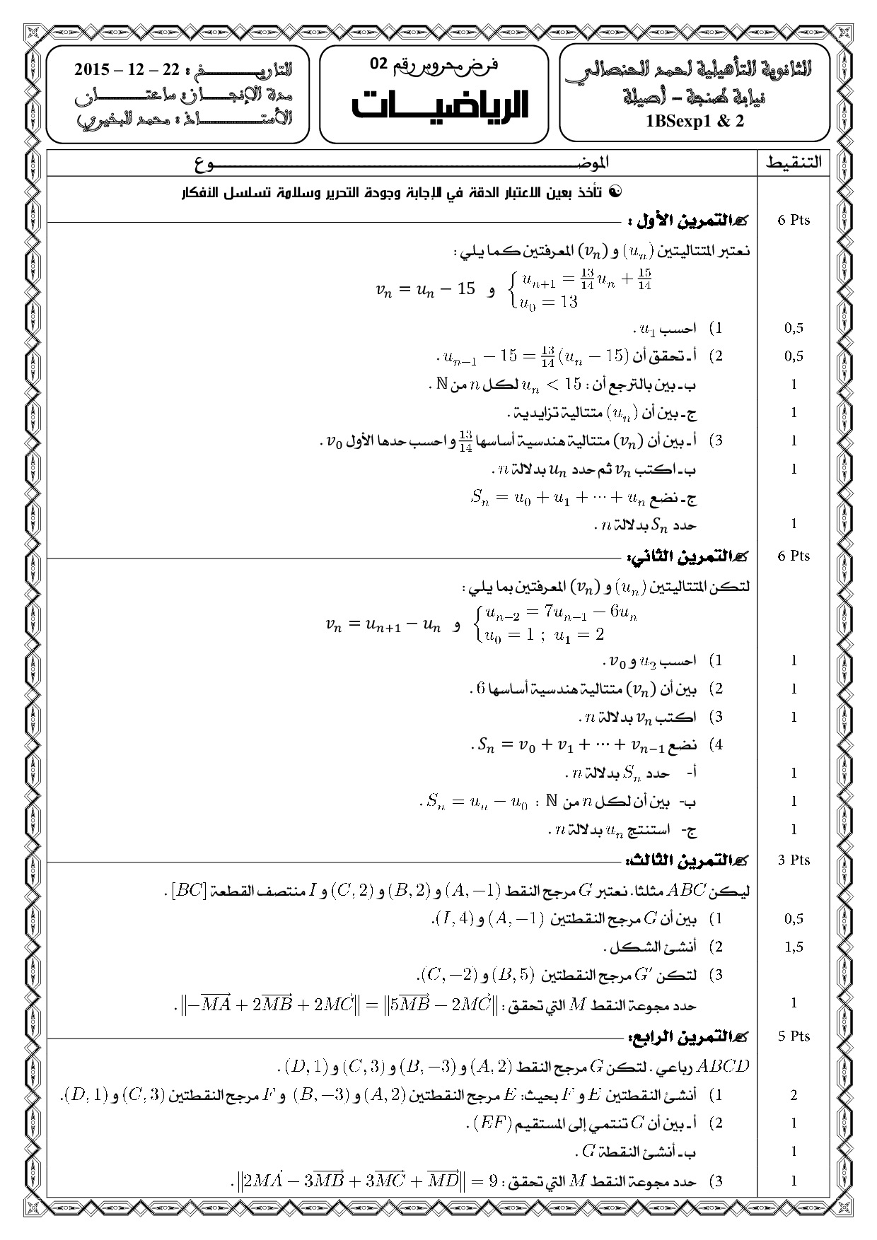 الفرض 2 نموذج 5 - الرياضيات أولى باك علوم تجريبية الدورة الأولى