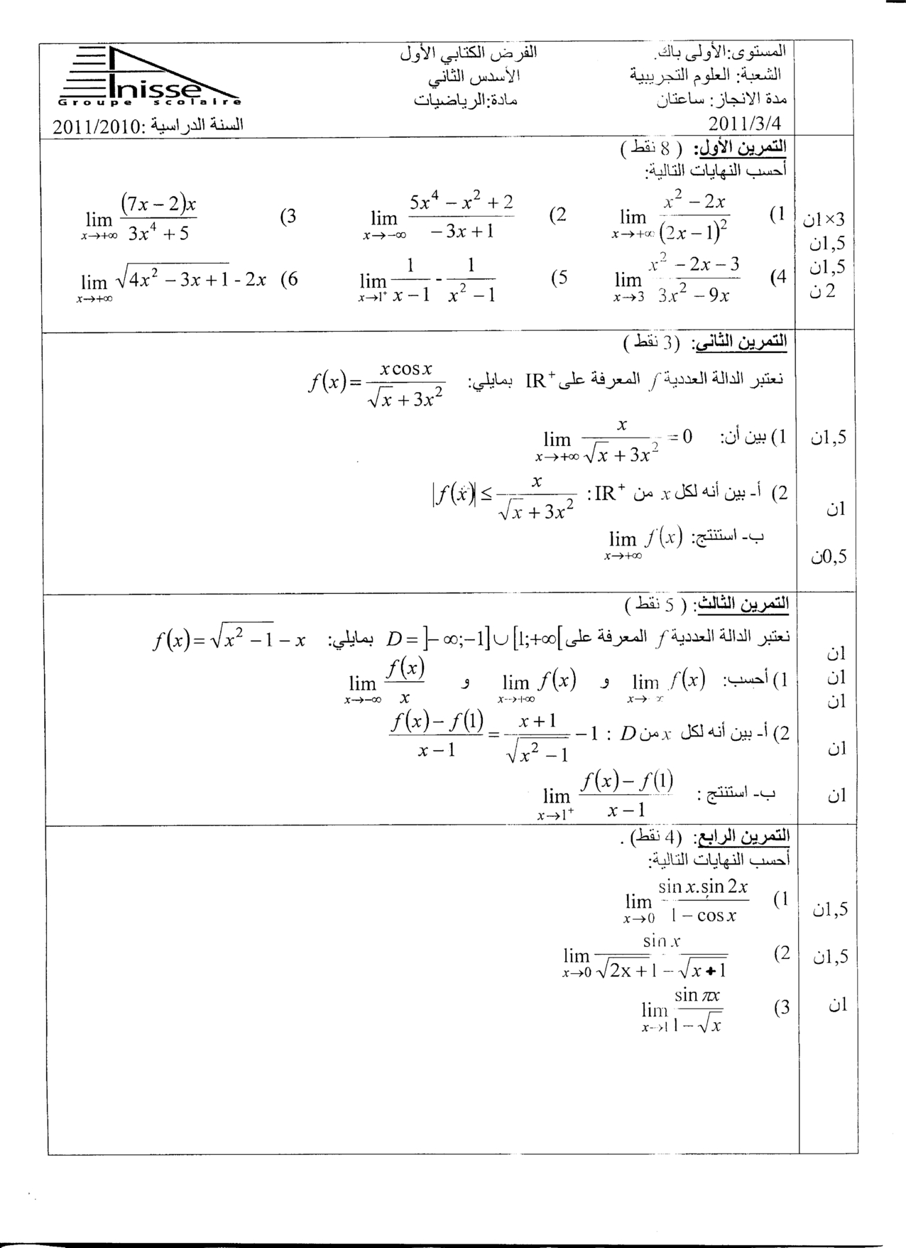 الفرض 1 نموذج 8 - الرياضيات أولى باك علوم تجريبية الدورة الثانية