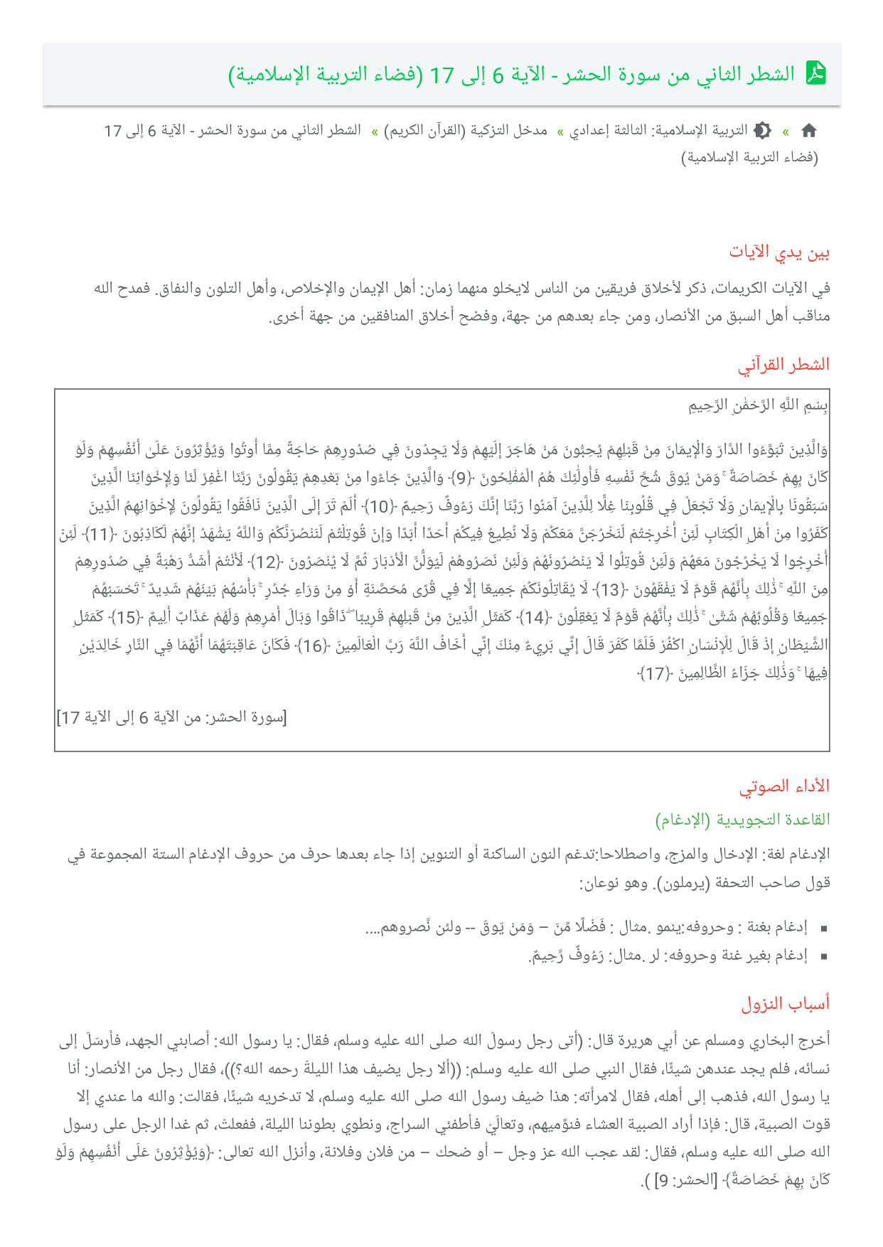 الشطر الثاني من سورة الحشر - الآية 6 إلى 17 (فضاء التربية الإسلامية)