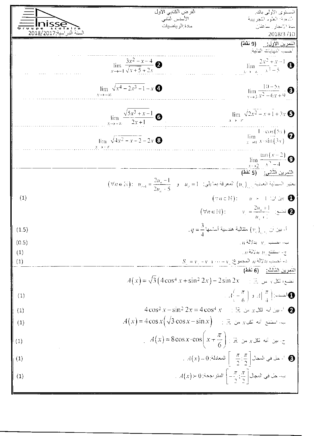 الفرض 1 نموذج 10 - الرياضيات أولى باك علوم تجريبية الدورة الثانية