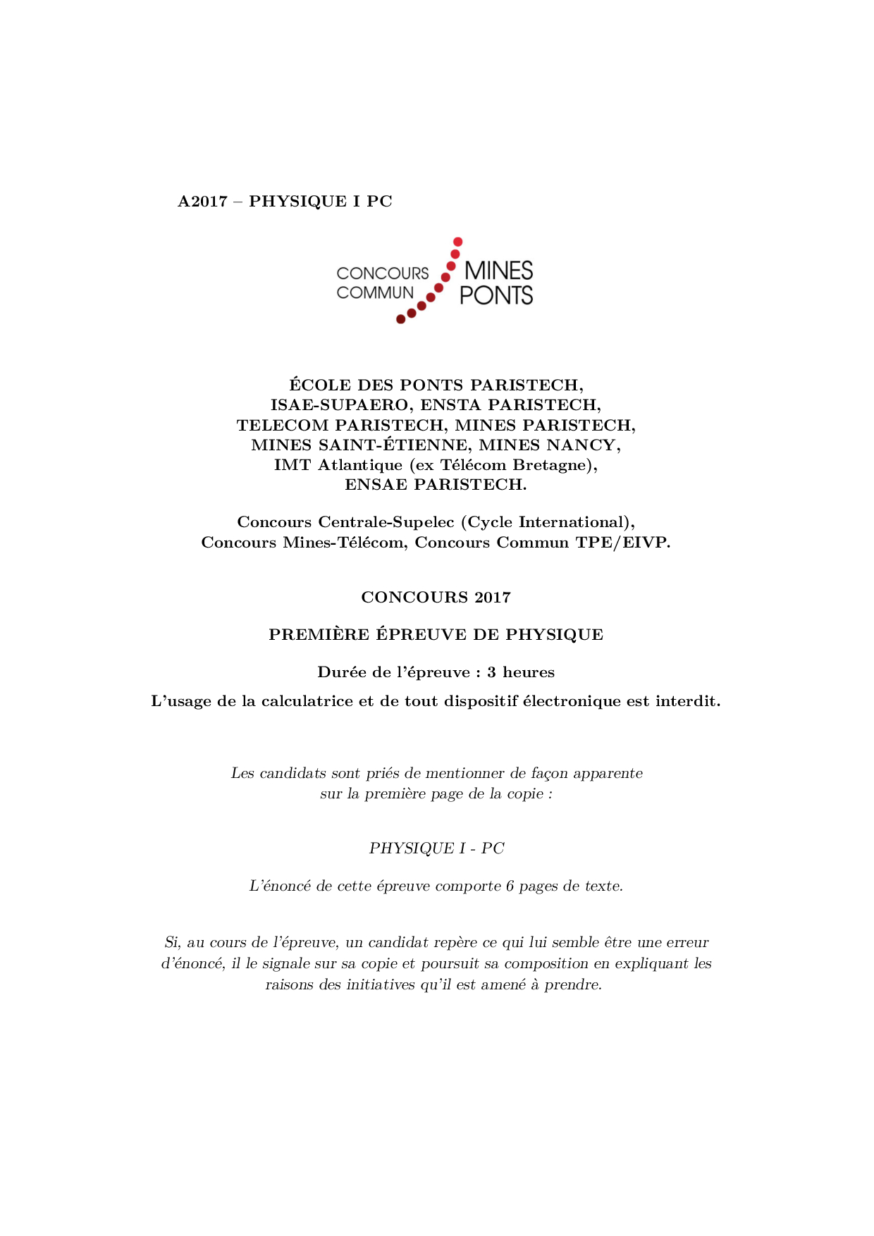 Mines-Ponts PC 2017 Physique 1 Enoncé