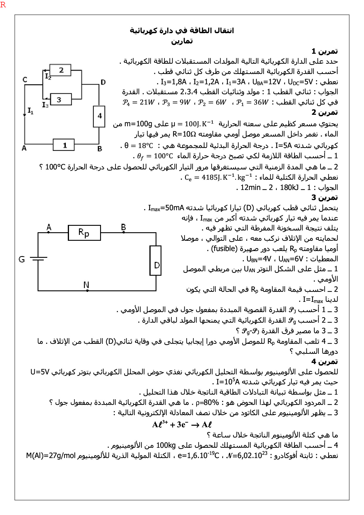 انتقال الطاقة في دارة كهربائية - سلسلة التمارين 1