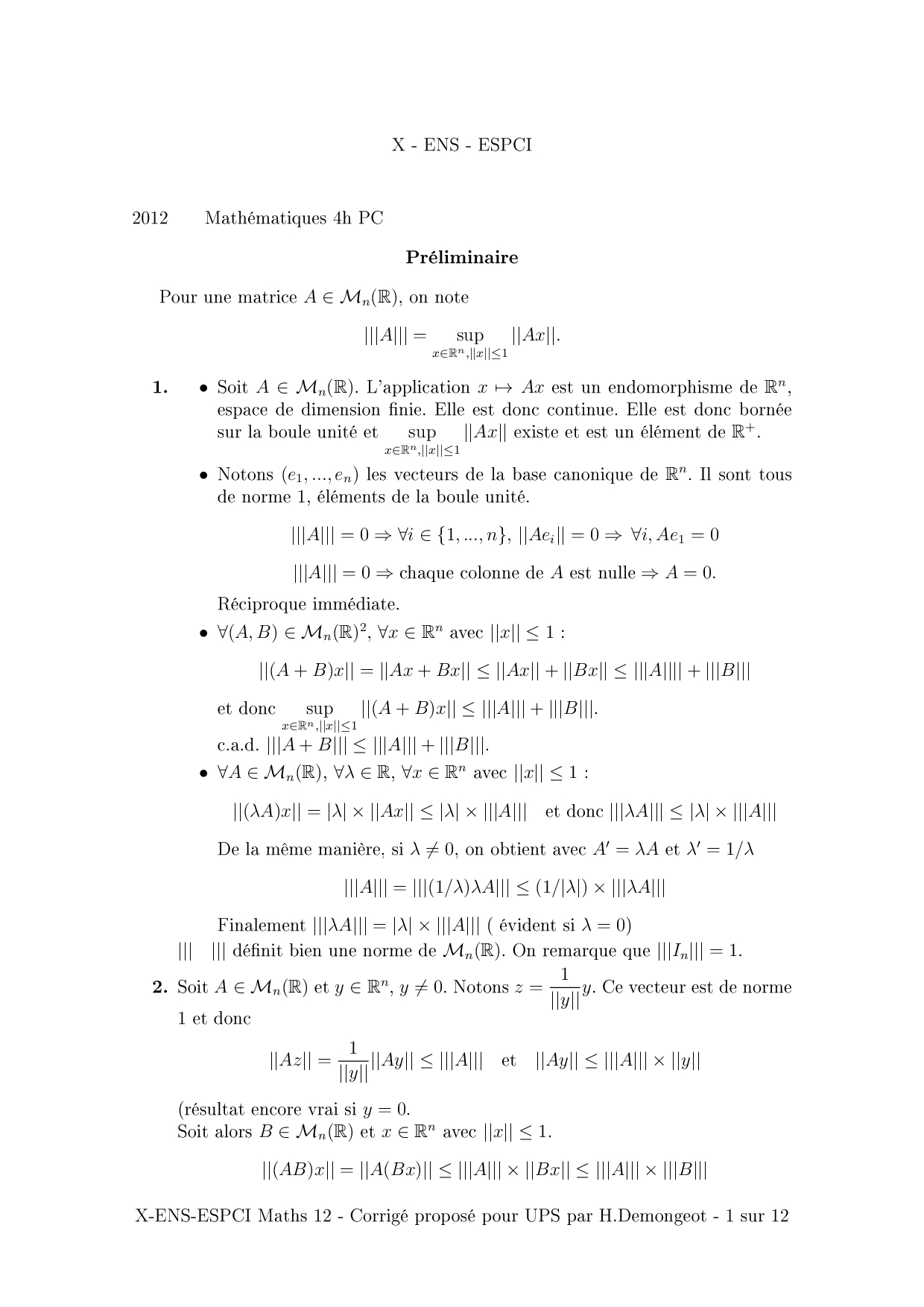 X-ENS-ESPCI PC 2012 Maths Corrigé