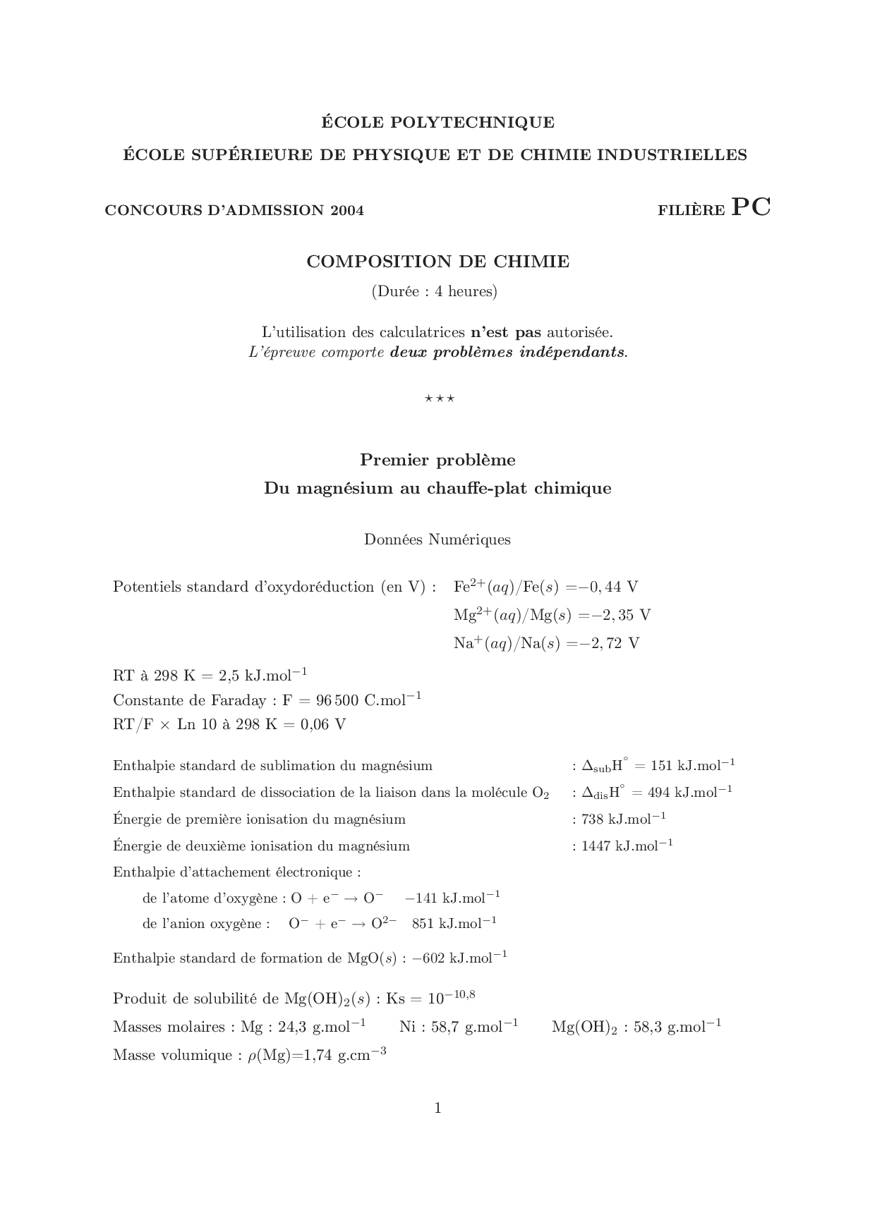 X-ENS-ESPCI PC 2004 Chimie Epreuve