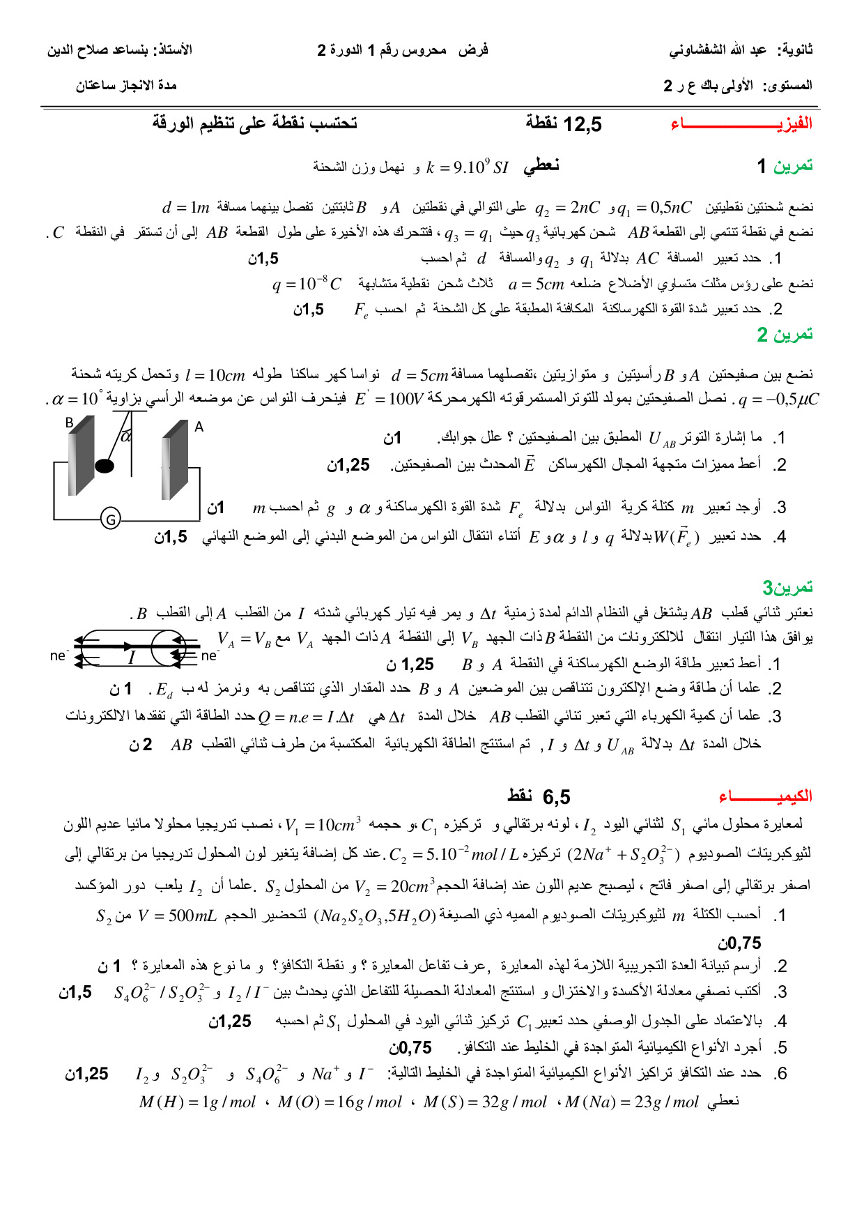 الفرض 1 نموذج 1 - الفيزياء والكيمياء أولى باك علوم رياضية الدورة الثانية