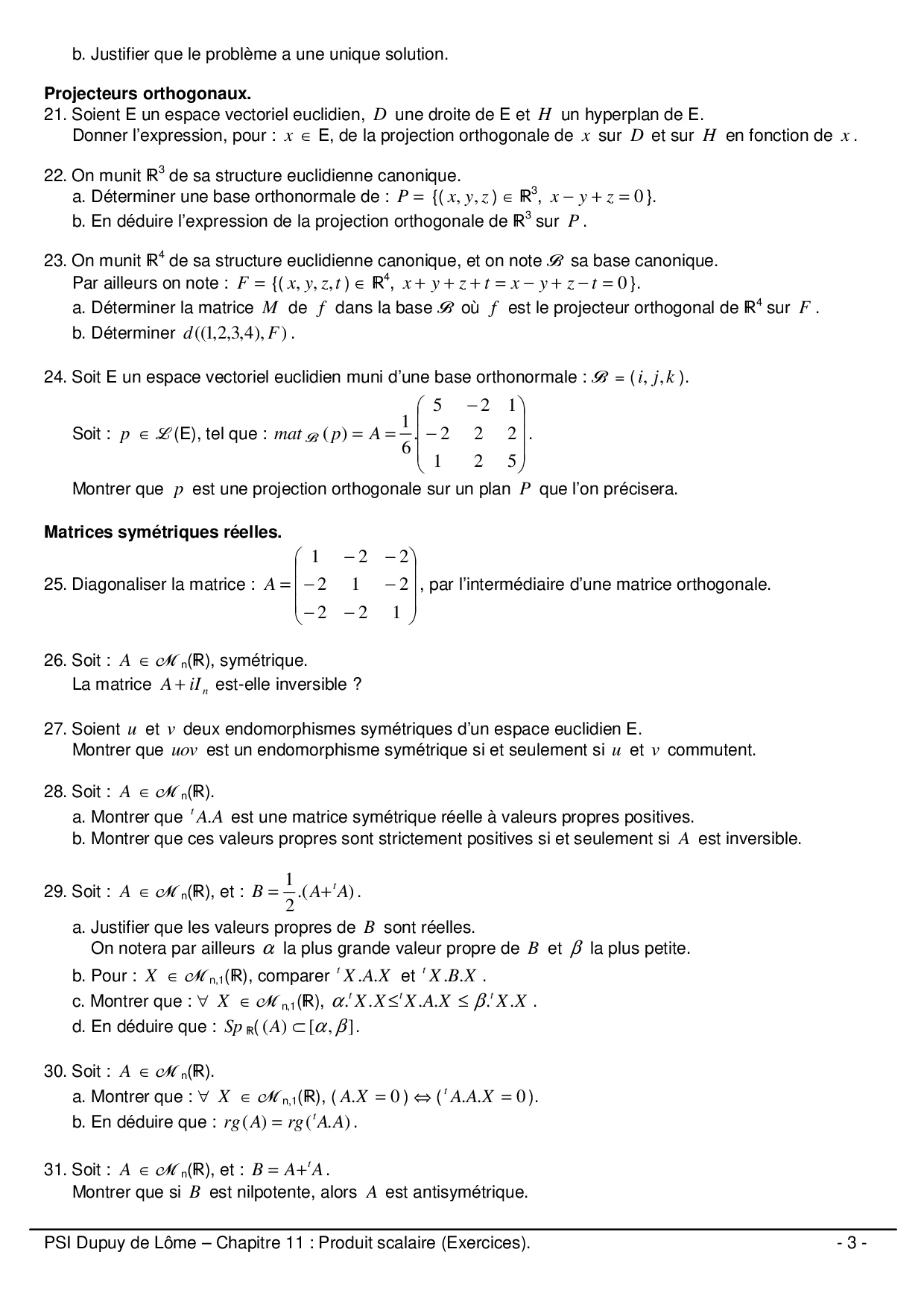 Produit scalaire, espaces euclidiens - Exercices (3 niveaux)