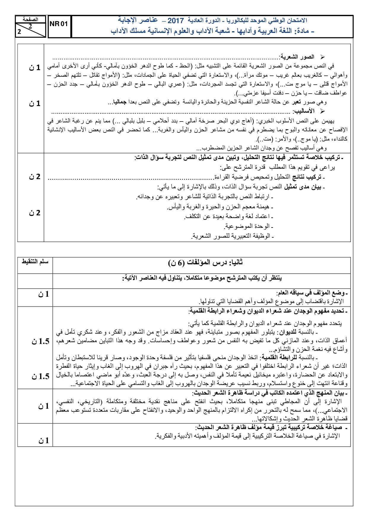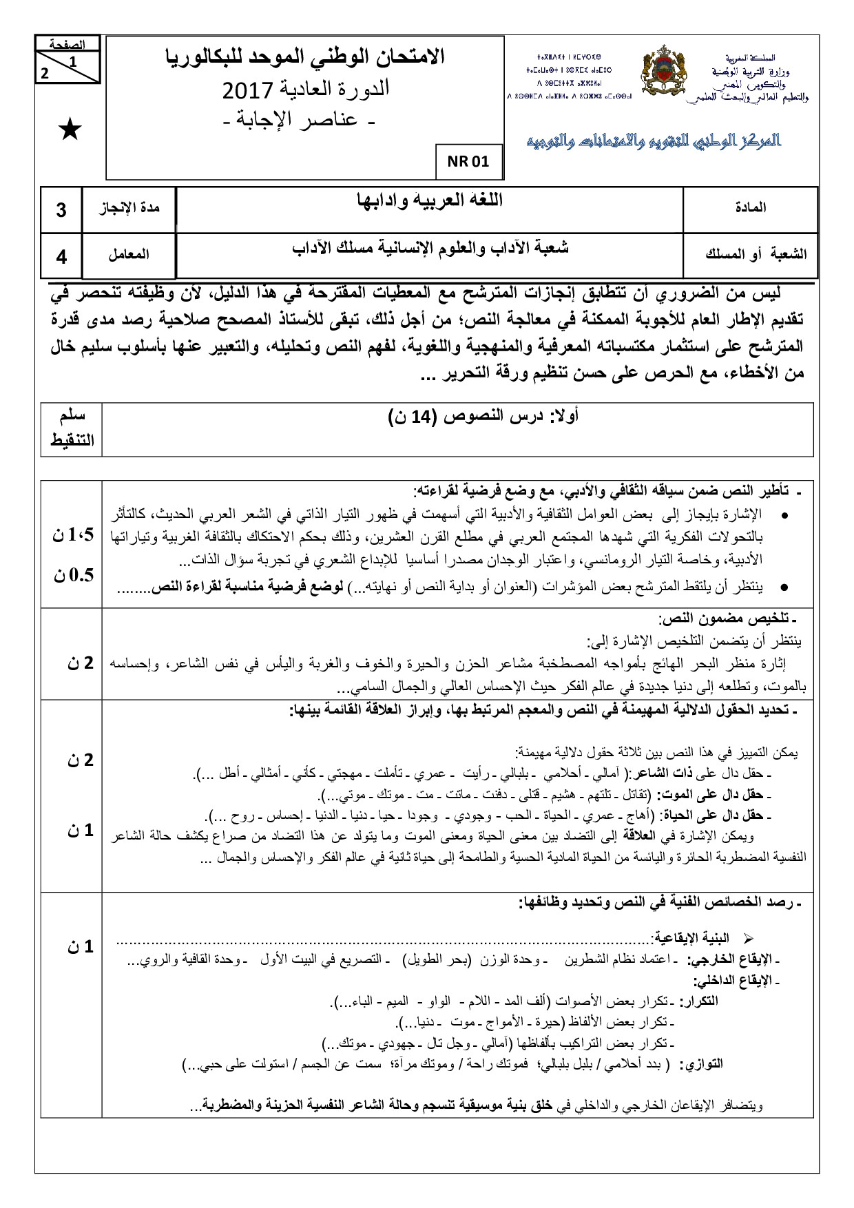 اللغة العربية (شعبة الآداب) 2017 الدورة العادية - التصحيح
