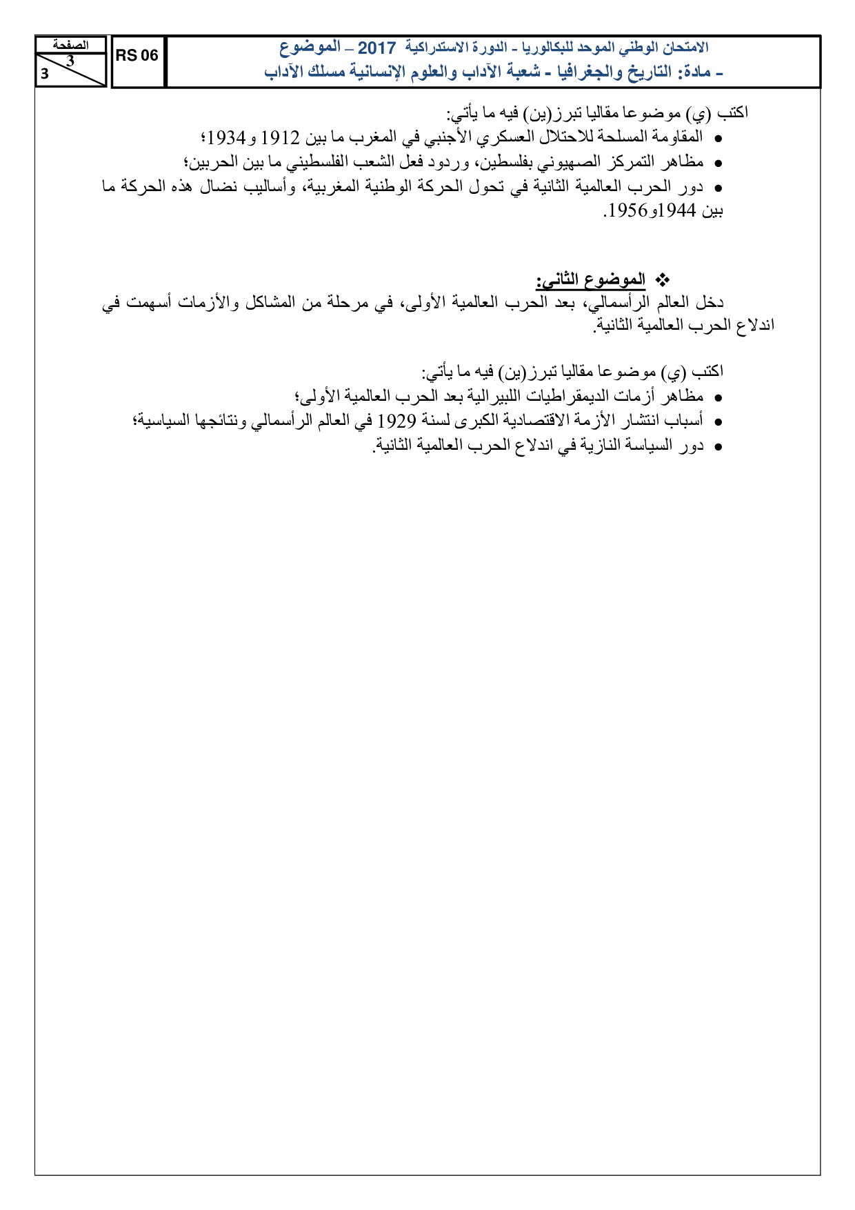 الإجتماعيات (شعبة الآداب) 2017 الدورة الإستدراكية - الموضوع
