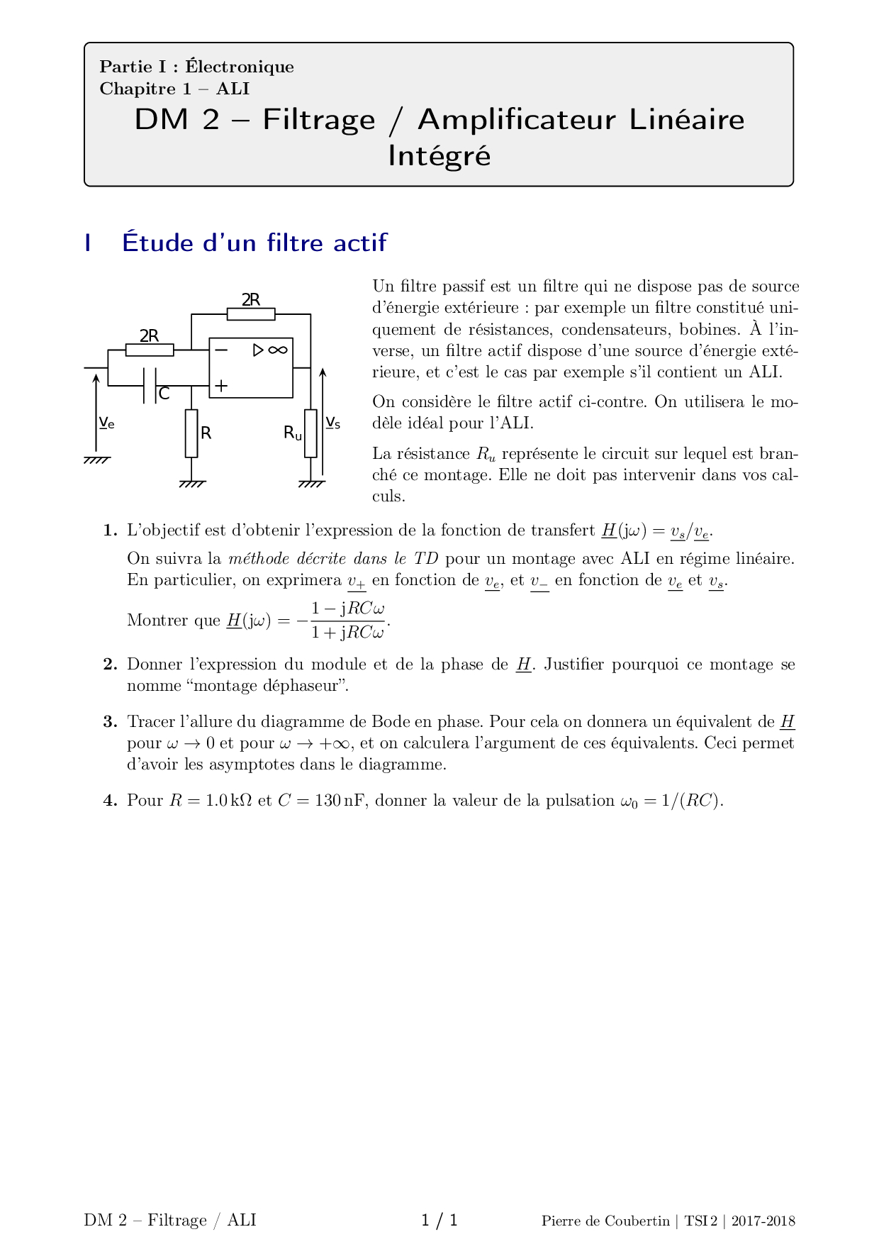 Etude d'un filtre actif - Enoncé