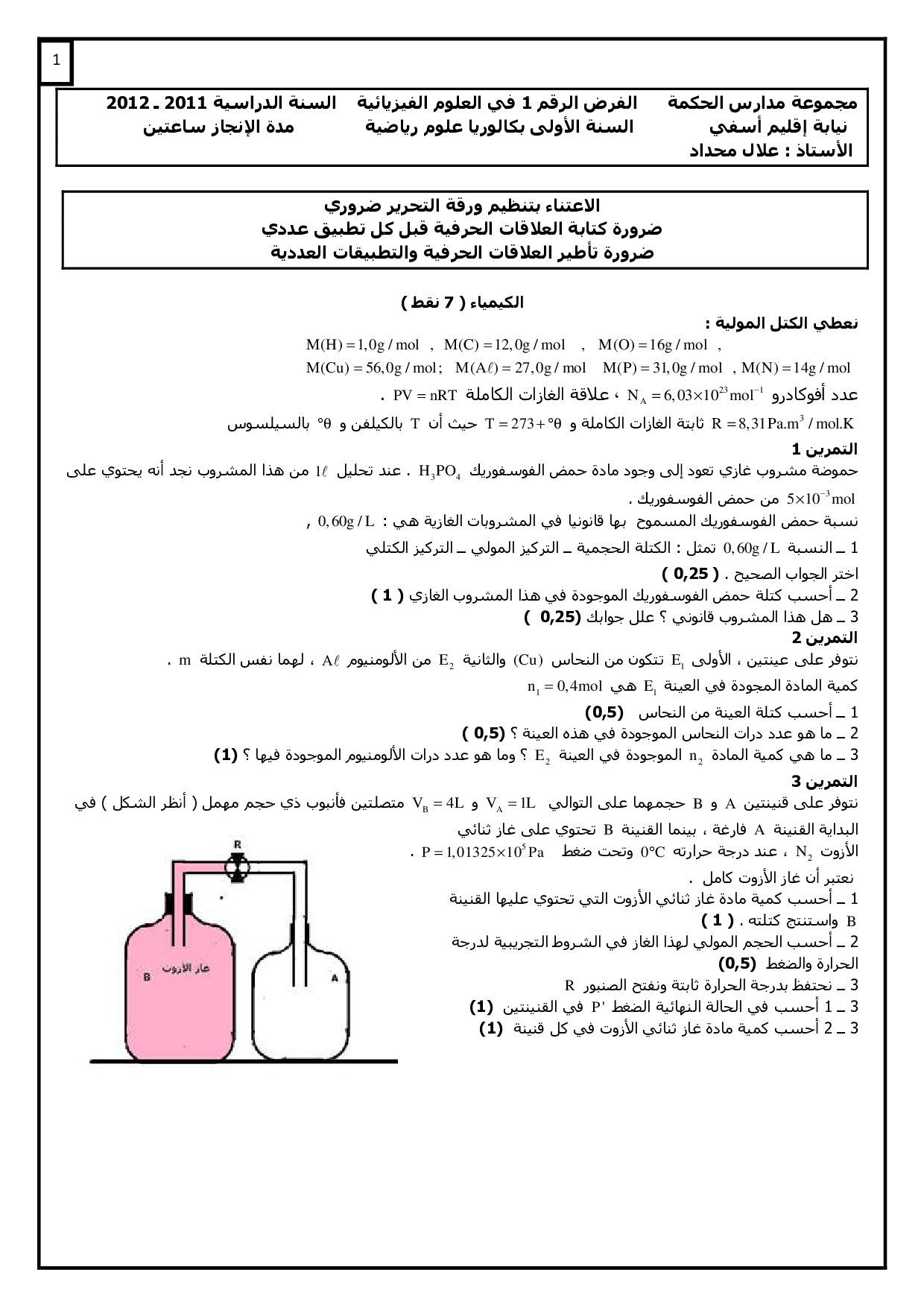 الفرض 1 نموذج 6 - الفيزياء والكيمياء أولى باك علوم رياضية الدورة الأولى