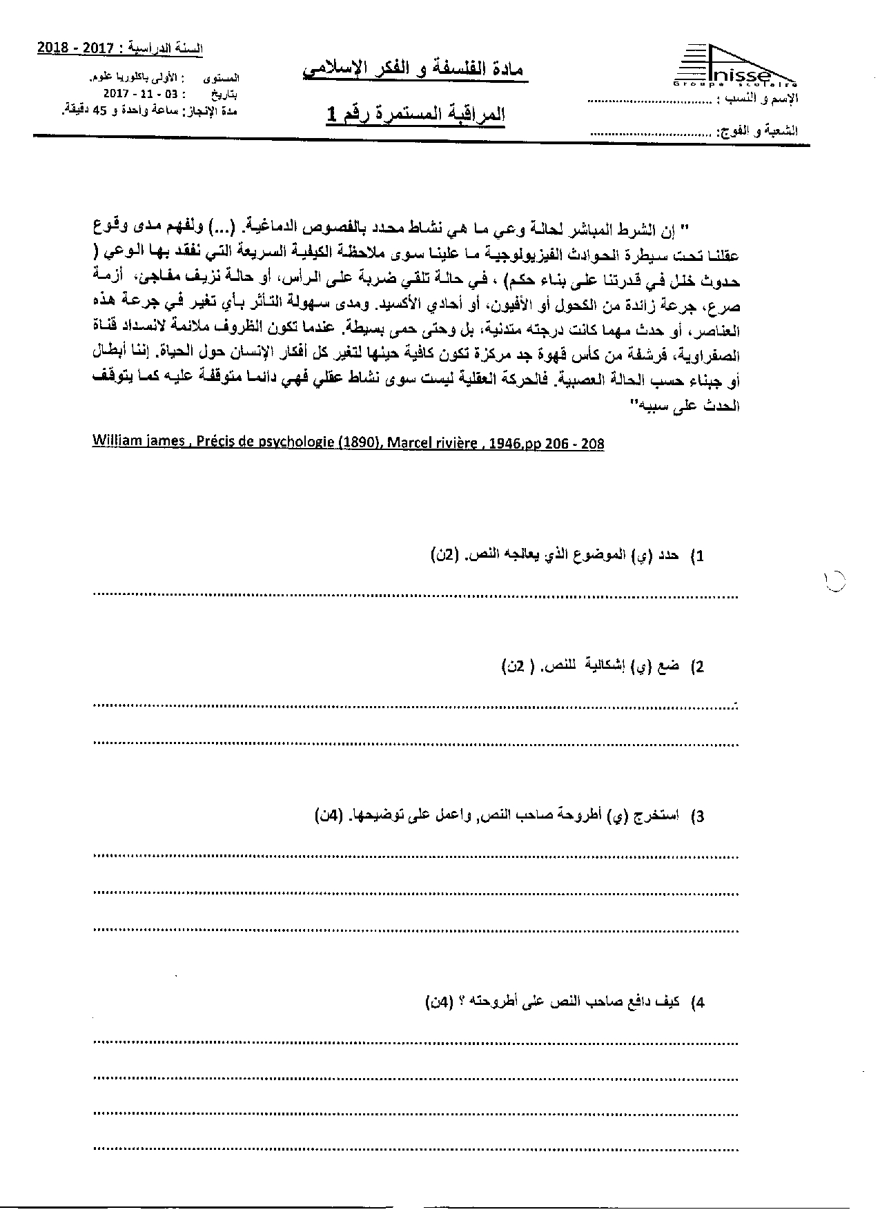 الفرض 1 نموذج 3 - الفلسفة أولى باك الدورة الأولى