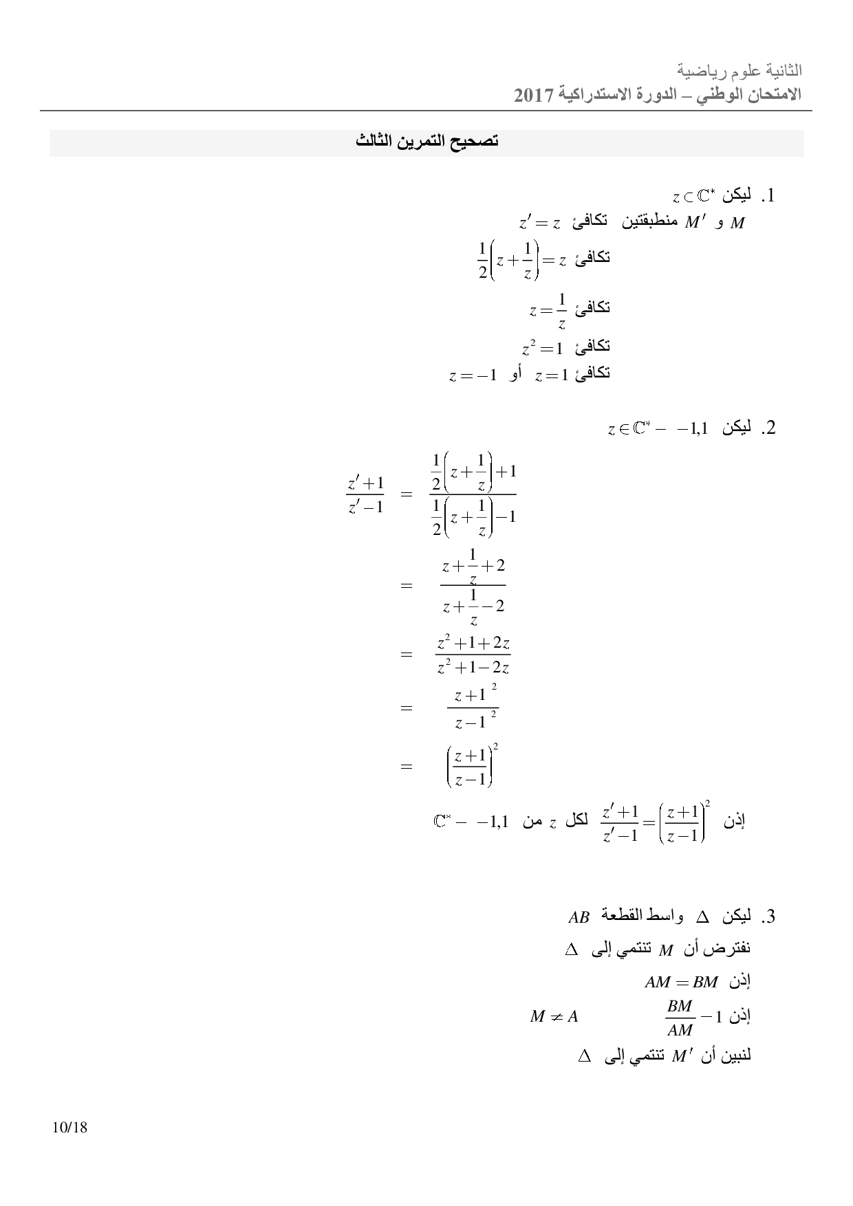 الرياضيات علوم رياضية 2017 الدورة الإستدراكية - التصحيح