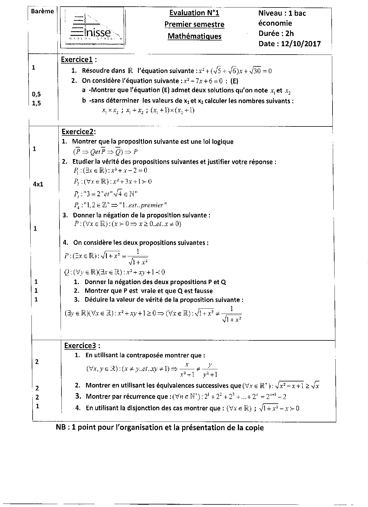 الفرض 1 نموذج 3 - الرياضيات أولى باك علوم إقتصادية الدورة الأولى