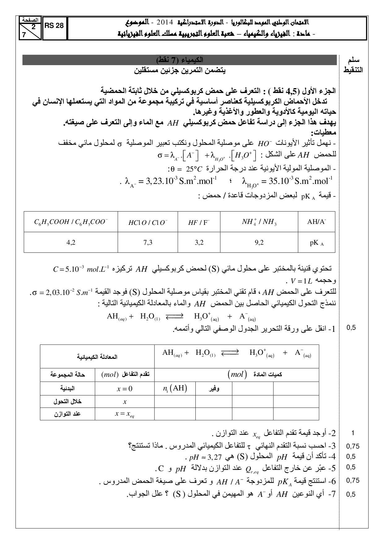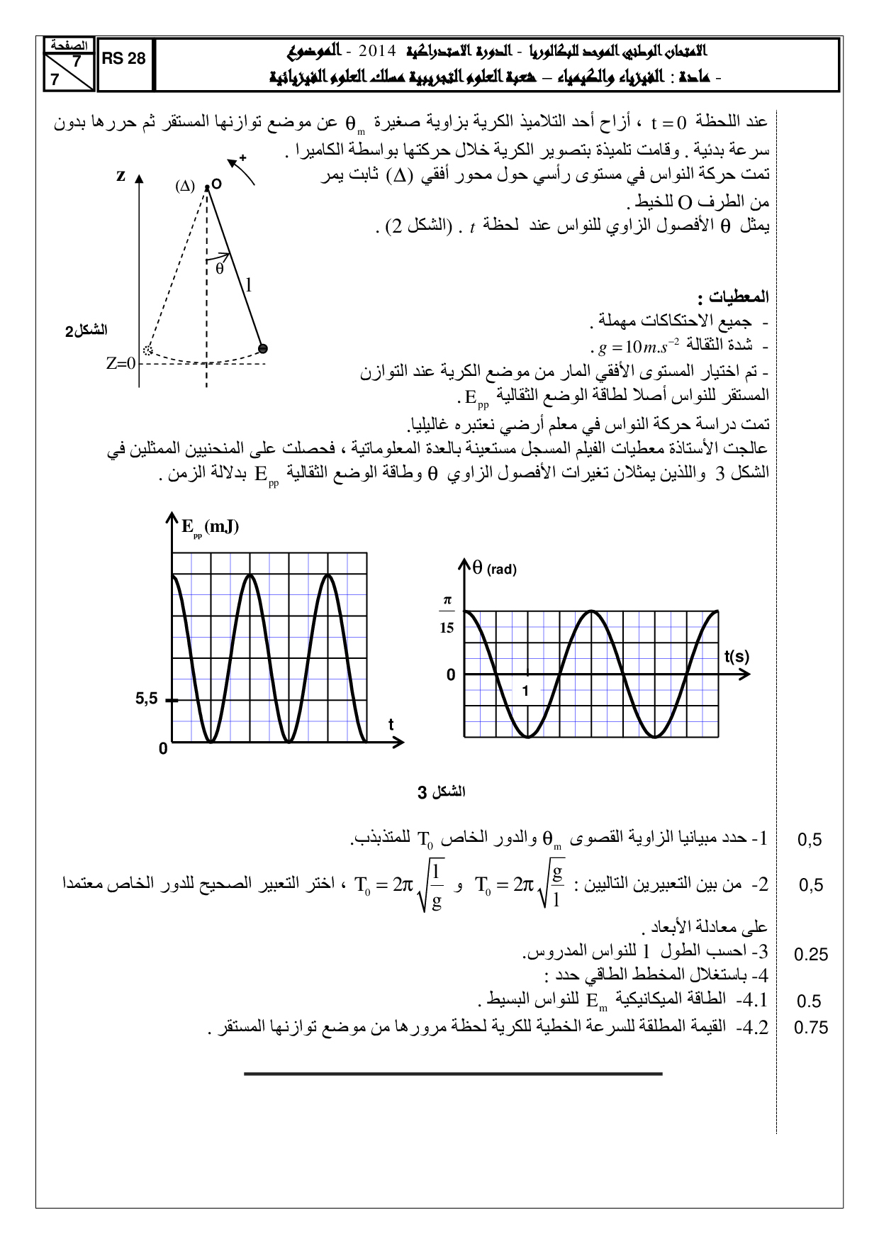 الفيزياء والكيمياء علوم فيزيائية 2014 الدورة الإستدراكية - الموضوع