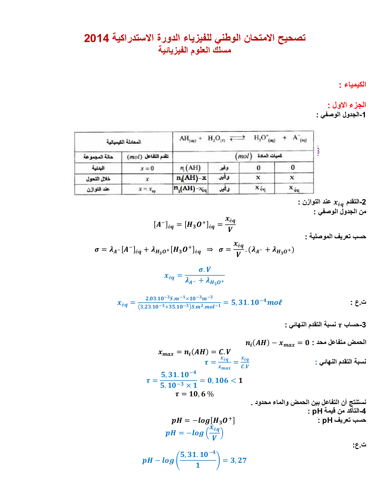 الفيزياء والكيمياء علوم فيزيائية 2014 الدورة الإستدراكية - التصحيح