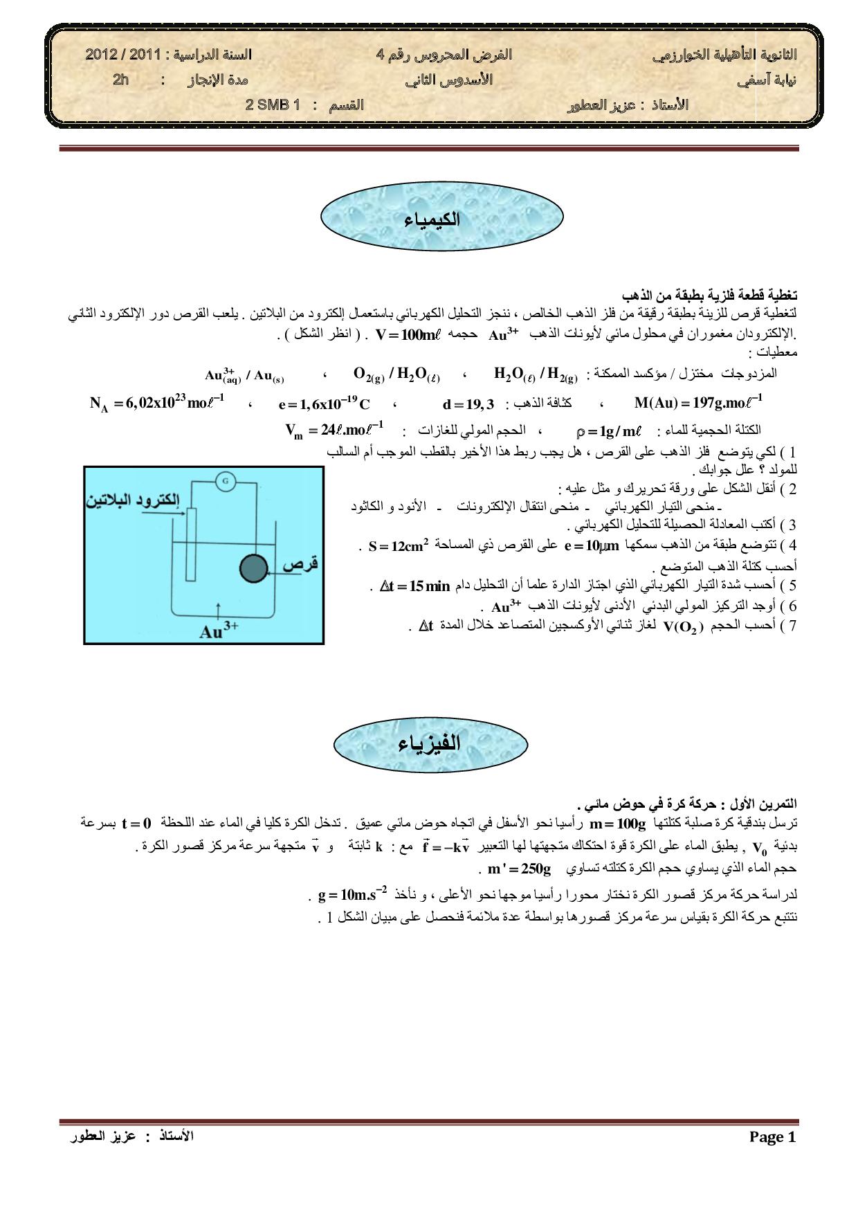 الفرض 1 نموذج 4 - الفيزياء والكيمياء ثانية باك علوم رياضية الدورة الثانية