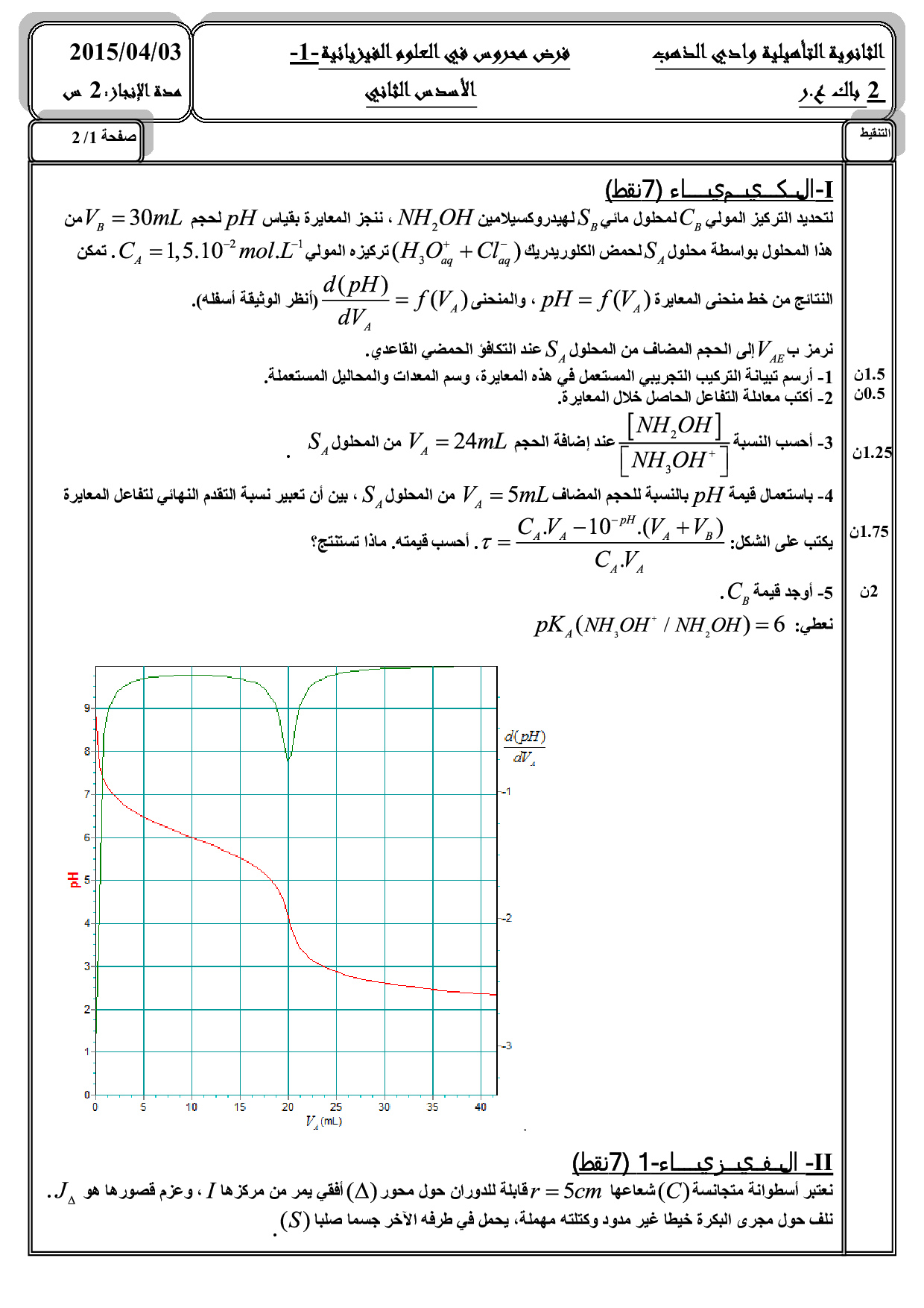 الفرض 1 نموذج 3 - الفيزياء والكيمياء ثانية باك علوم رياضية الدورة الثانية