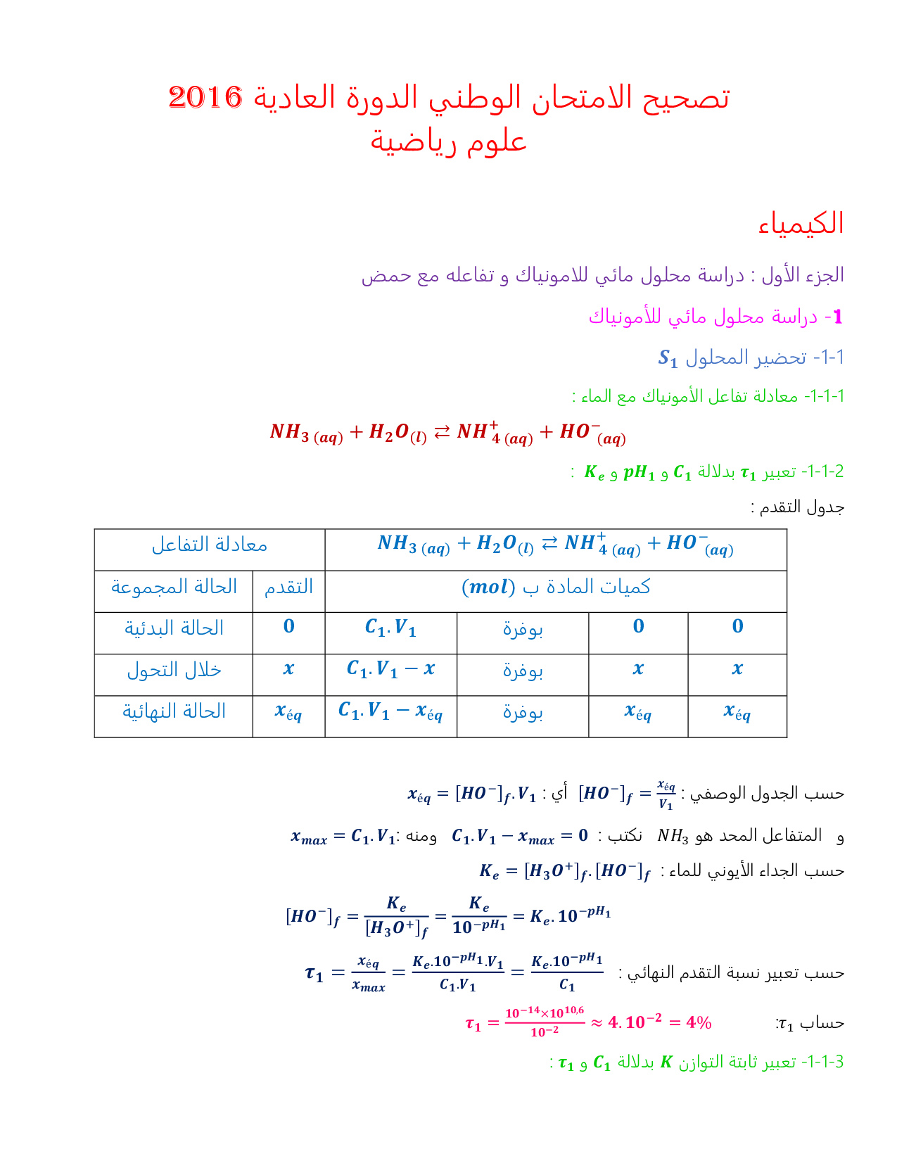 الفيزياء والكيمياء علوم رياضية 2016 الدورة العادية - التصحيح