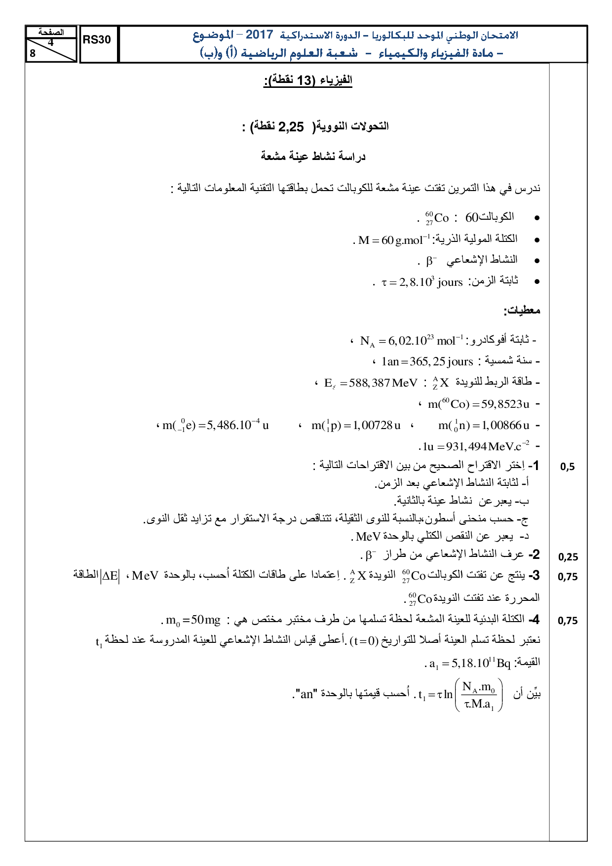 الفيزياء والكيمياء علوم رياضية 2017 الدورة الإستدراكية - الموضوع