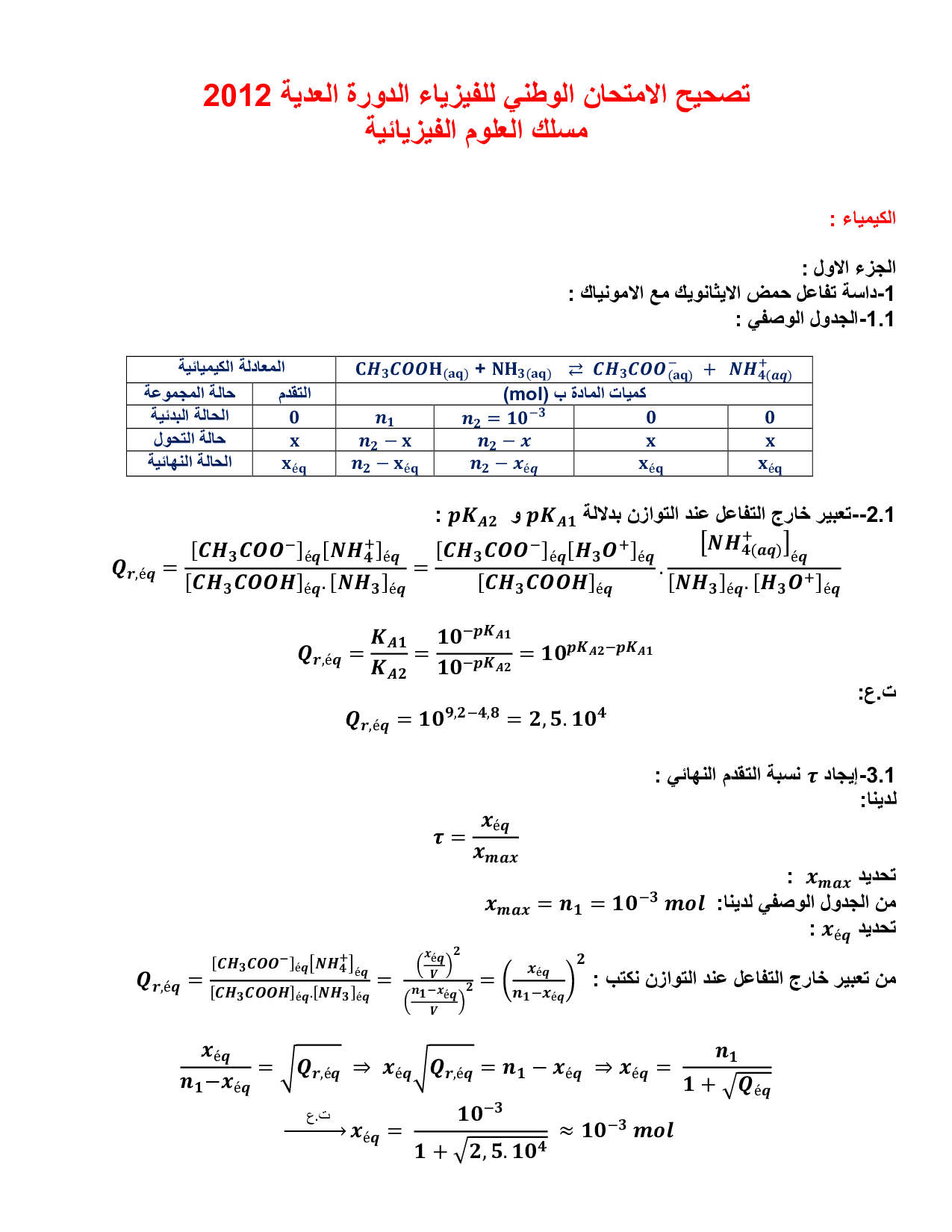 الفيزياء والكيمياء علوم فيزيائية 2012 الدورة العادية - التصحيح