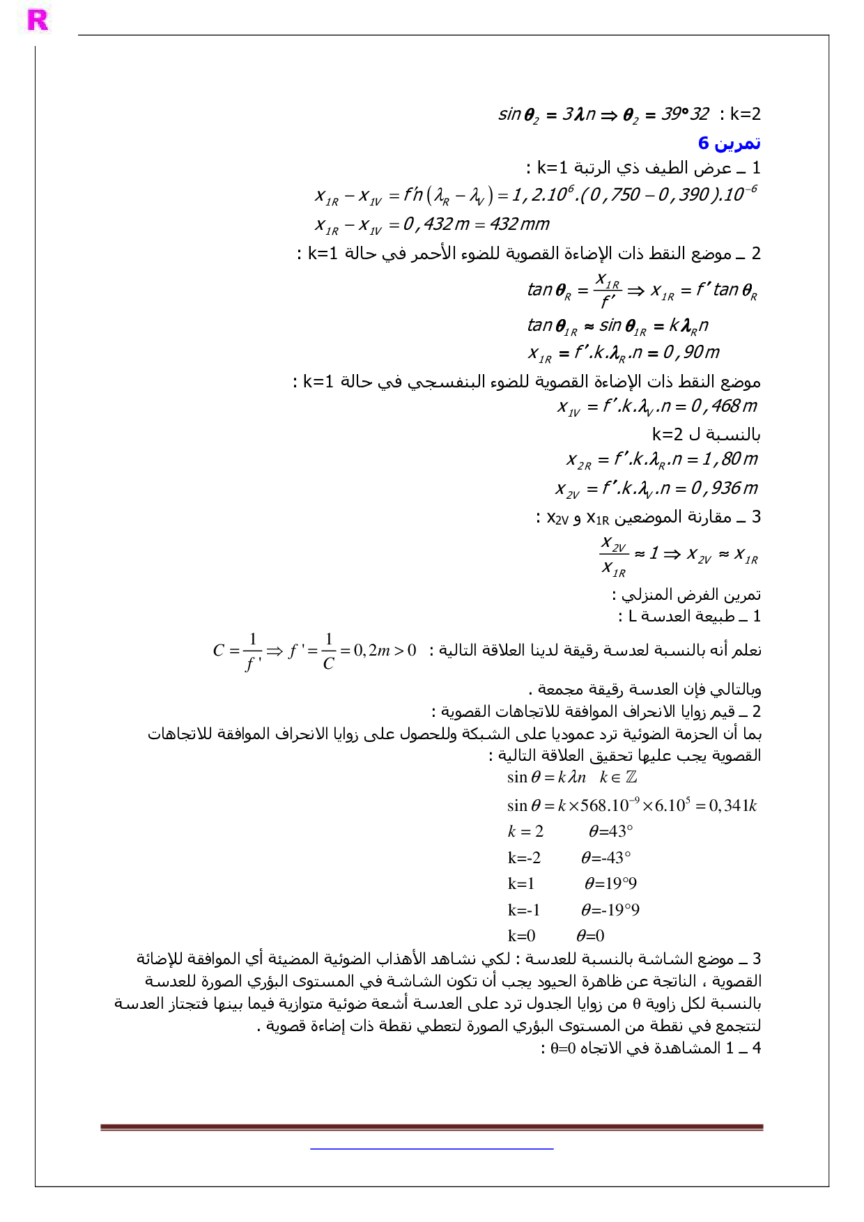 حيود الضوء بواسطة شبكة - تصحيح سلسلة التمارين 1