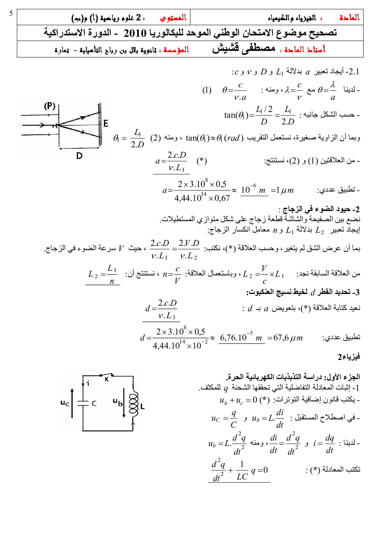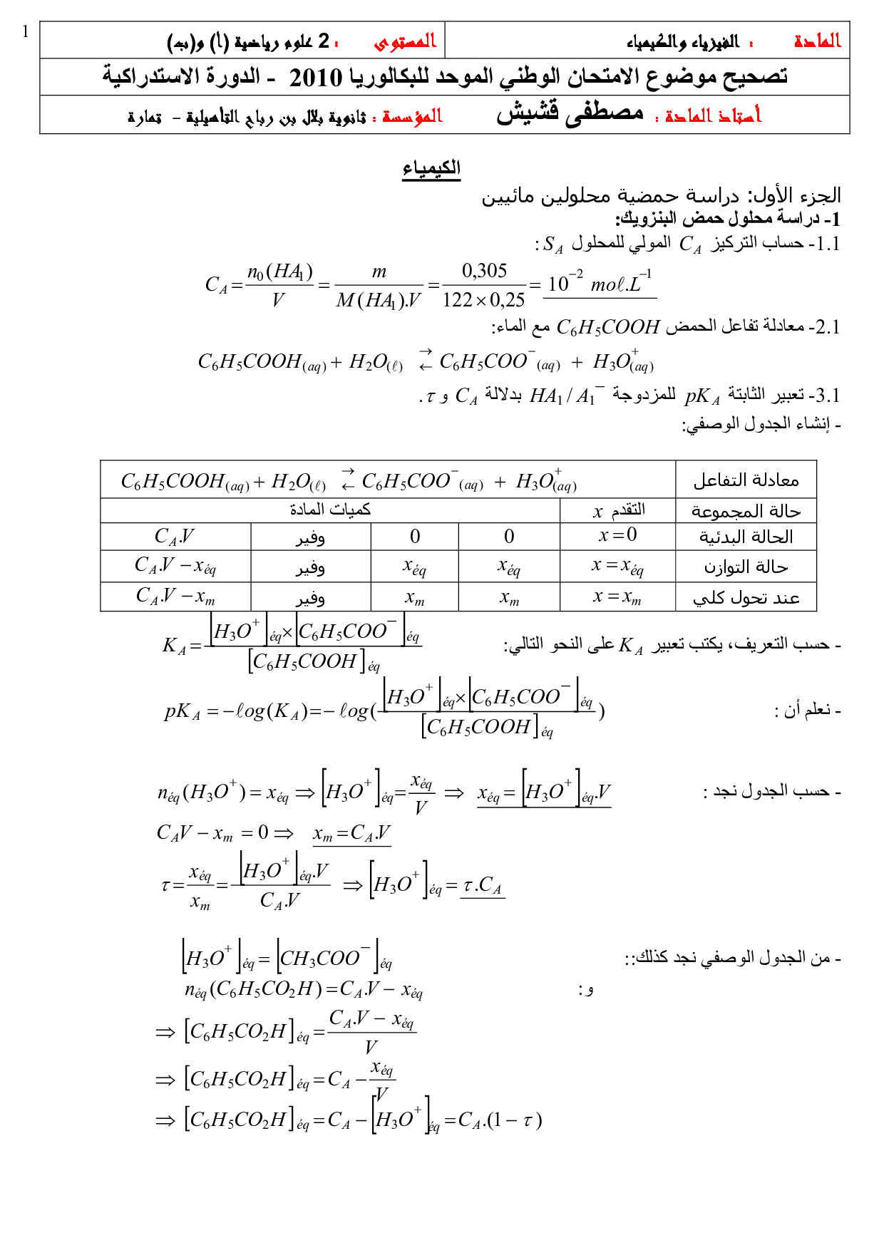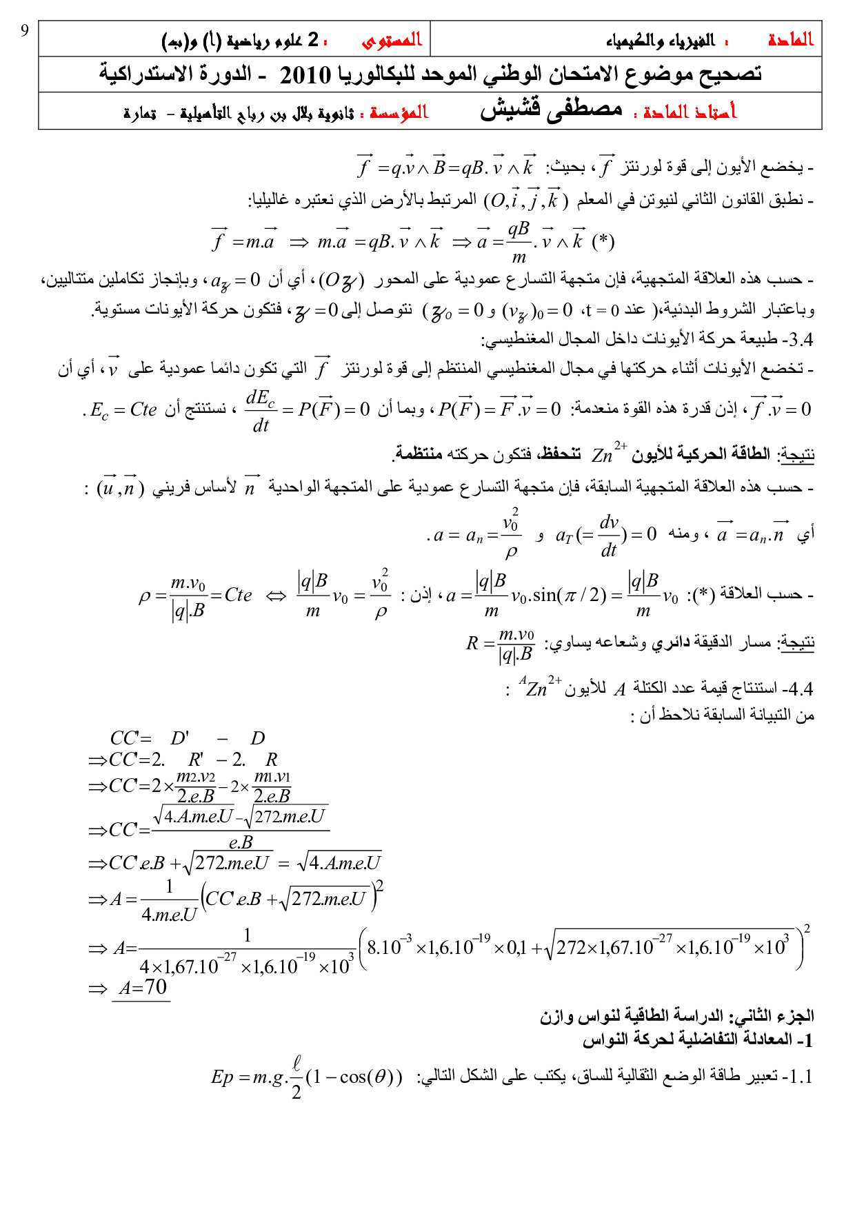 الفيزياء والكيمياء علوم رياضية 2010 الدورة الإستدراكية - التصحيح