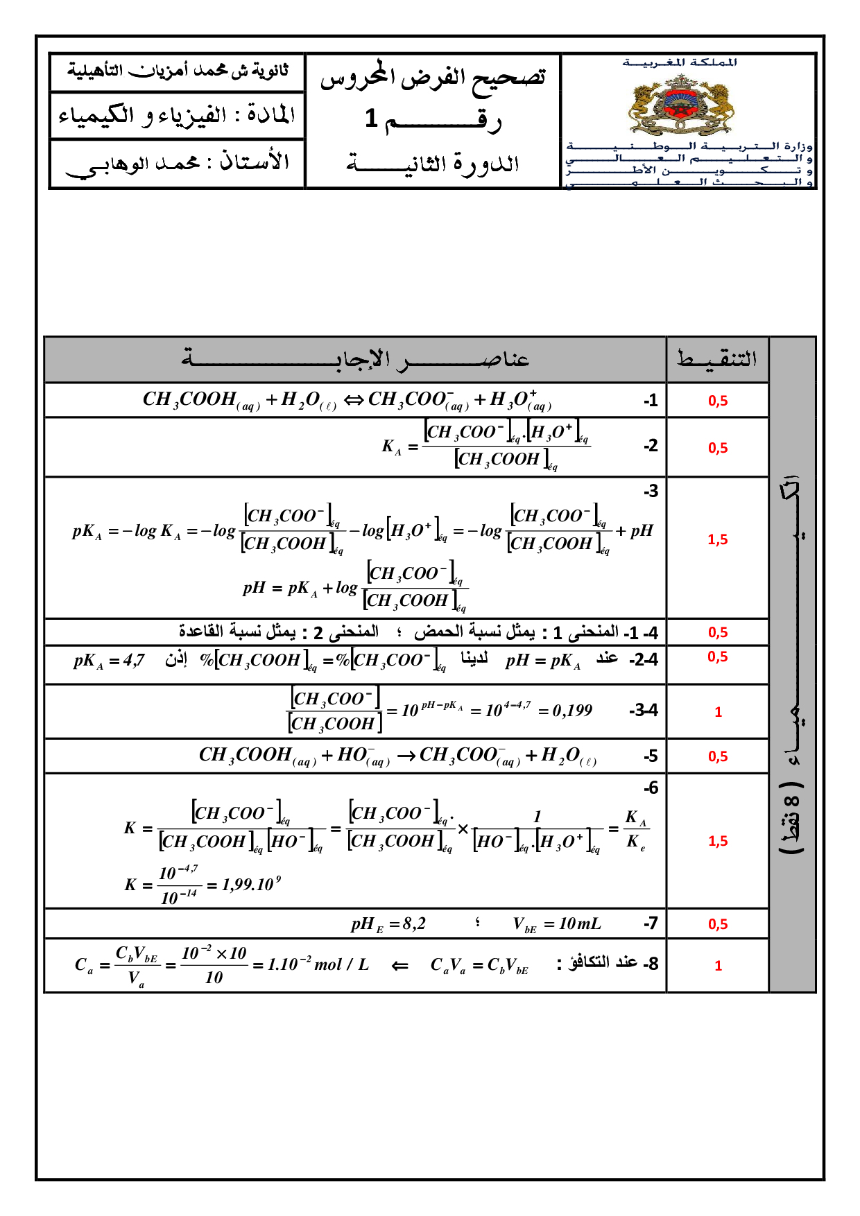 الفرض 1 نموذج 1 - الفيزياء والكيمياء ثانية باك علوم الحياة والأرض الدورة الثانية (التصحيح)