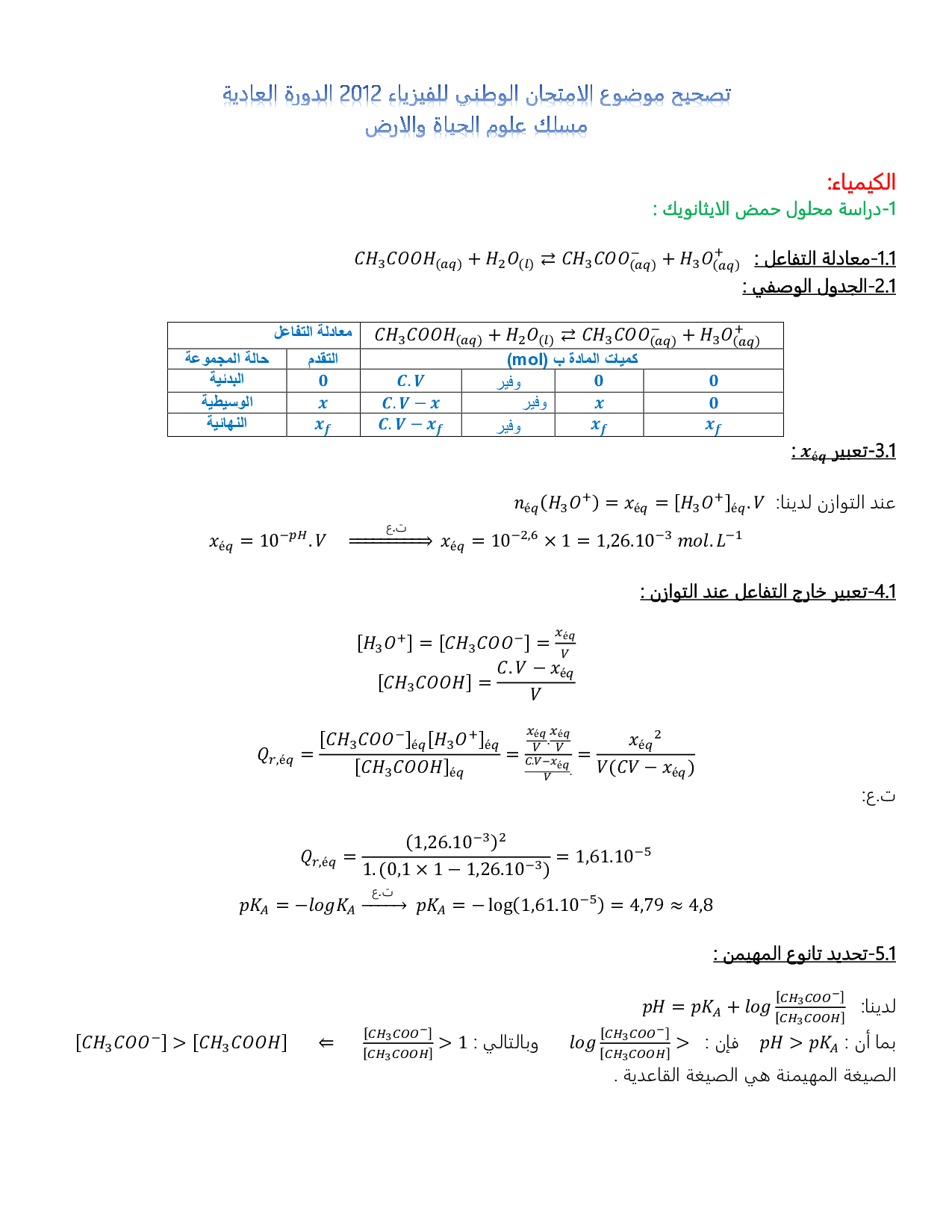 الفيزياء والكيمياء (علوم الحياة والأرض والعلوم والتكنولوجيات) 2012 الدورة العادية - التصحيح