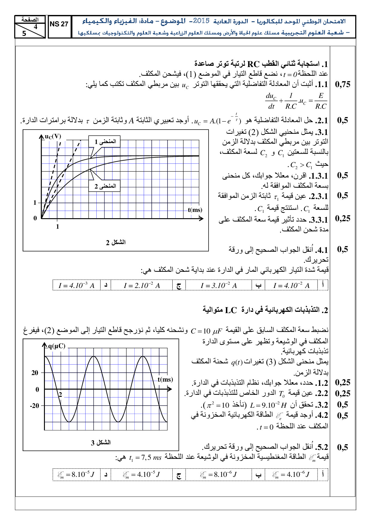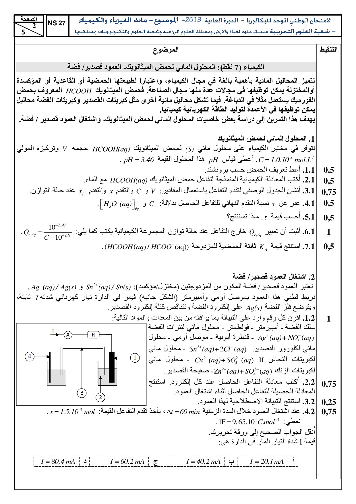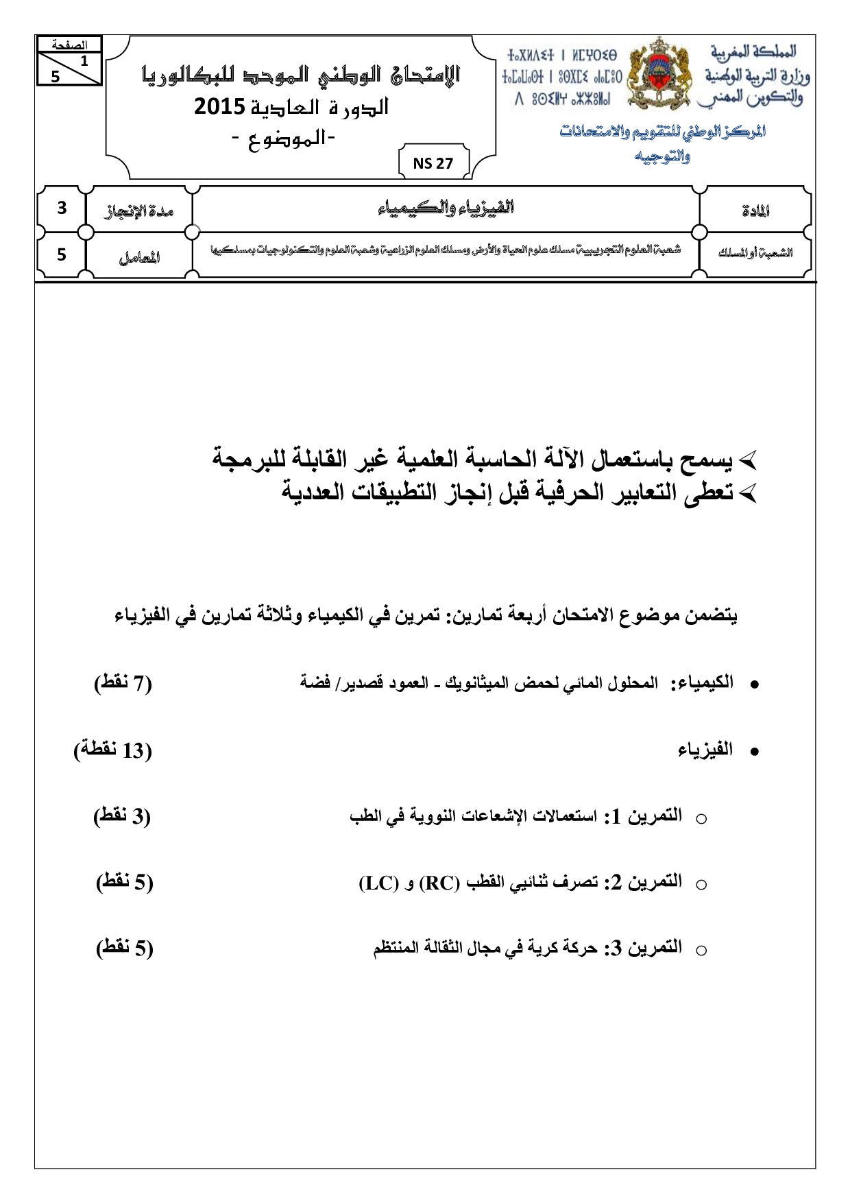 الفيزياء والكيمياء (علوم الحياة والأرض والعلوم والتكنولوجيات) 2015 الدورة العادية - الموضوع