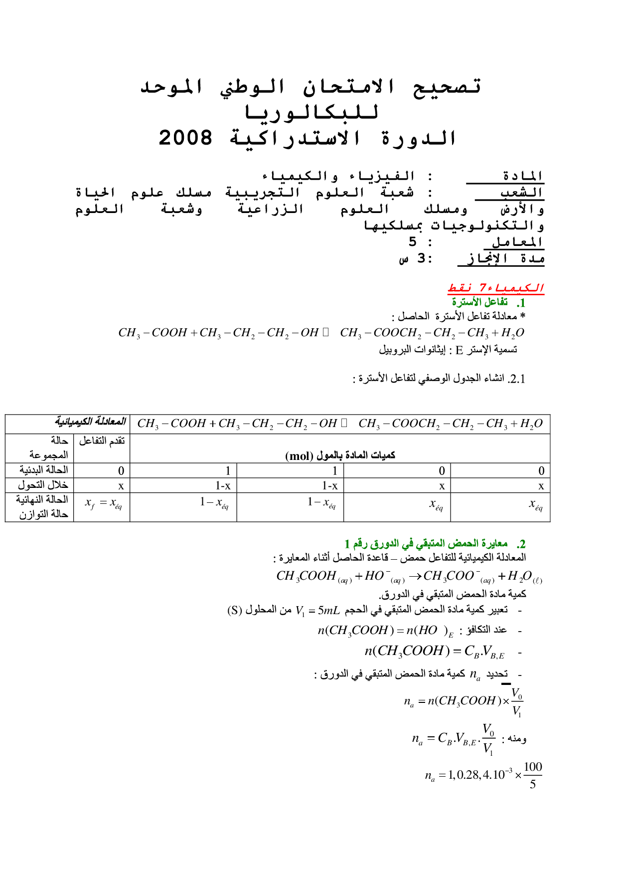 الفيزياء والكيمياء (علوم الحياة والأرض والعلوم والتكنولوجيات) 2008 الدورة الإستدراكية - التصحيح
