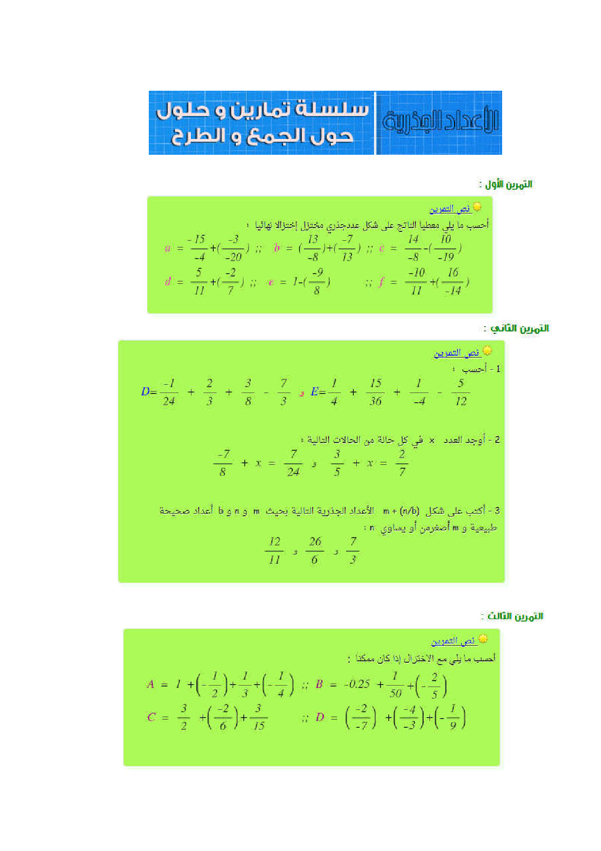 جمع وطرح الأعداد الجذرية - سلسلة التمارين 1