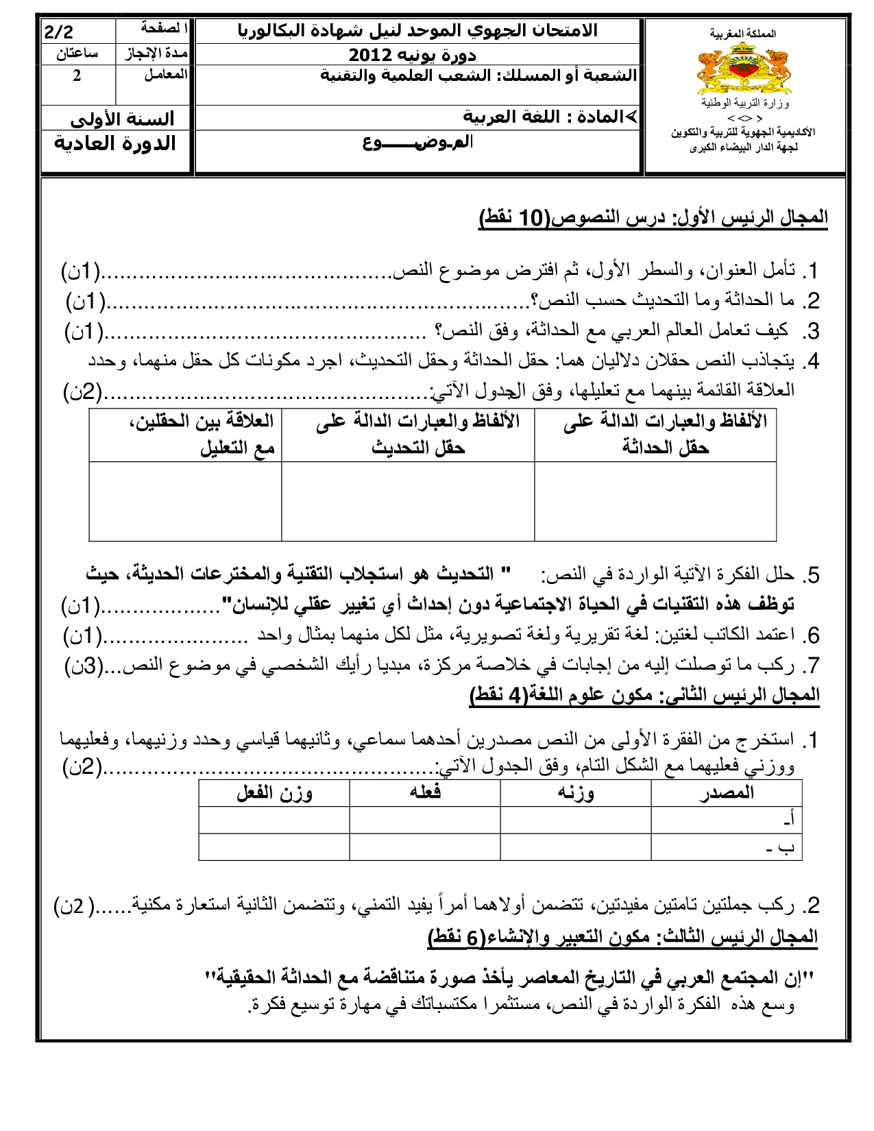 اللغة العربية: الأولى باك علوم وتكنولوجيات ميكانيكية