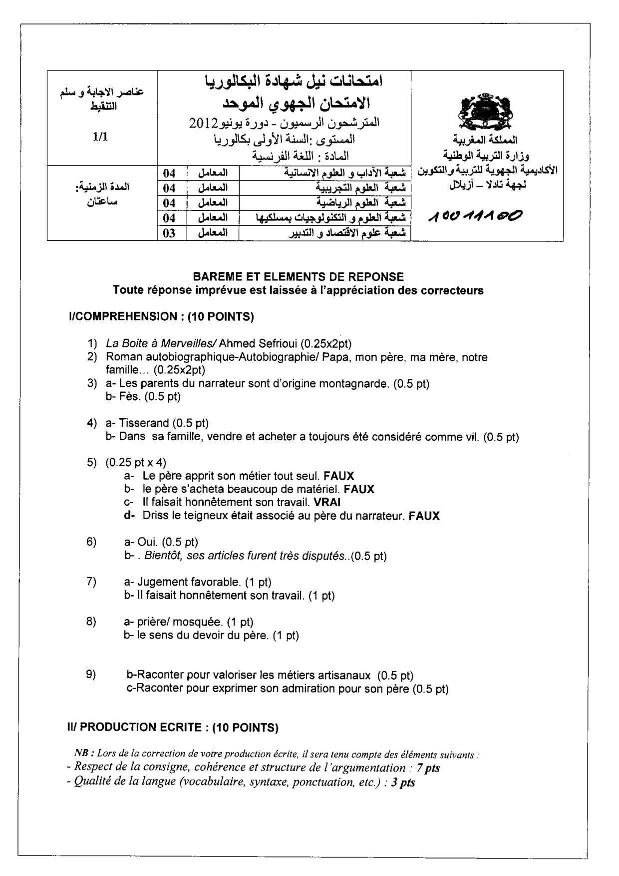 Tadla 2012 : Corrigé
