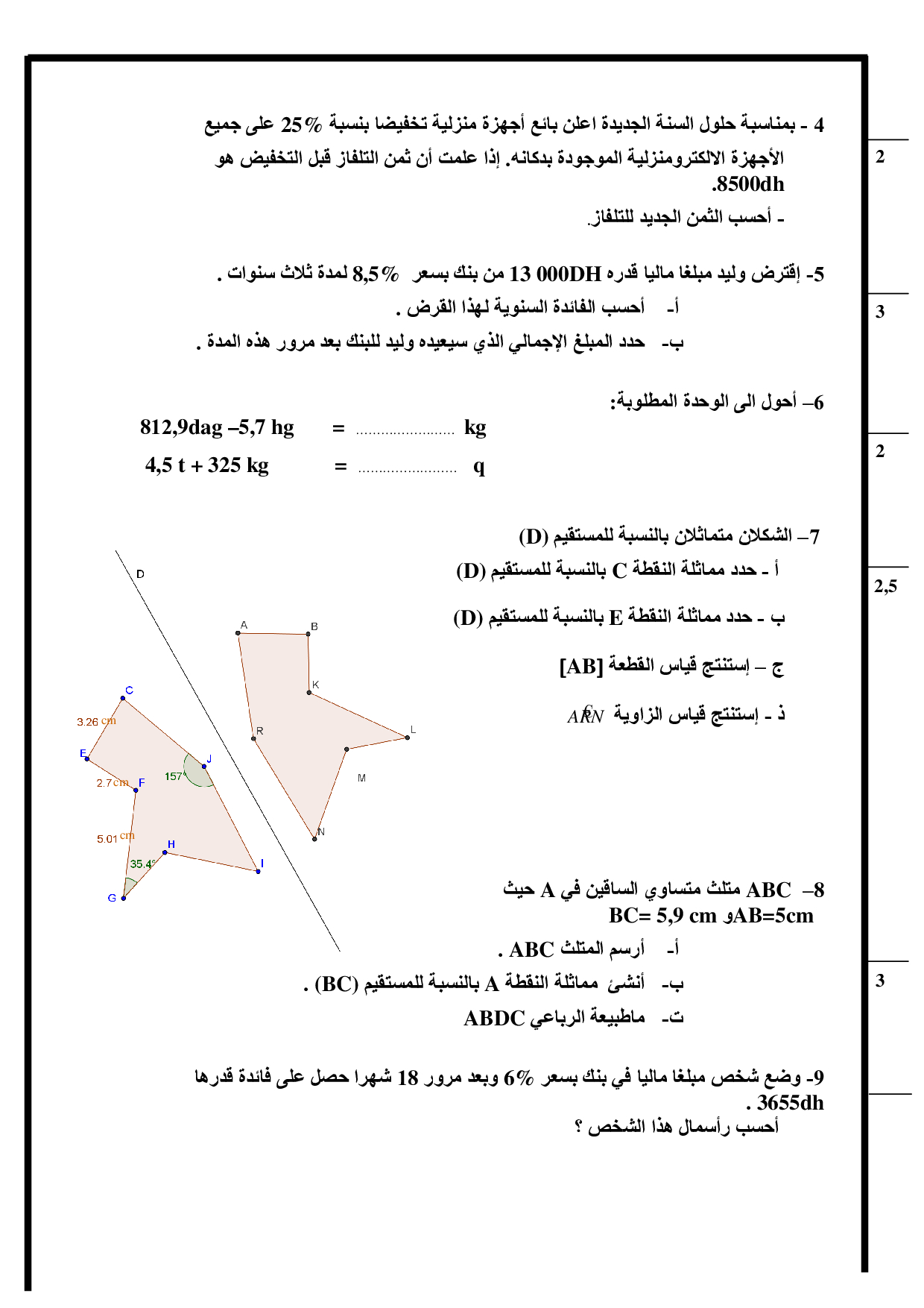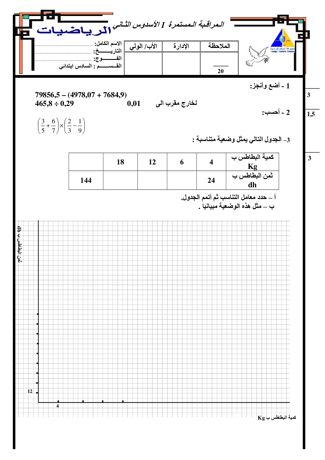 الفرض 1 نموذج 7 - الرياضيات سادس إبتدائي الدورة الثانية