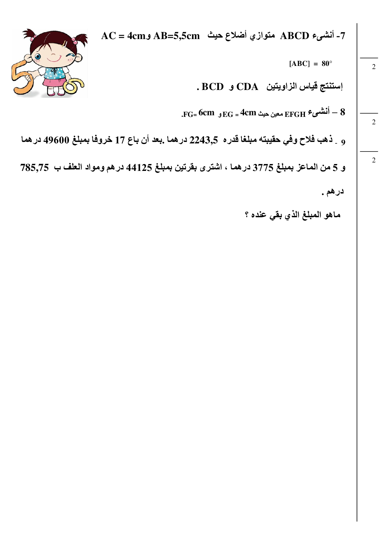 الفرض 1 نموذج 4 - الرياضيات خامس إبتدائي الدورة الثانية
