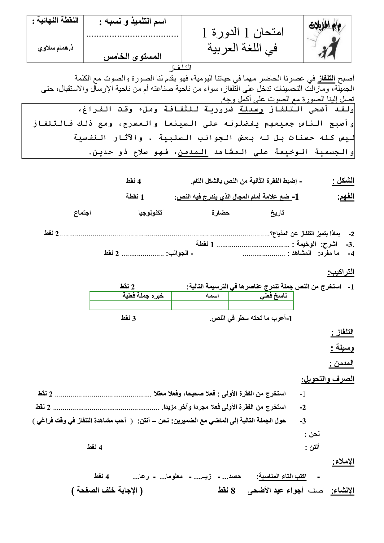 الفرض 1 نموذج 2 - اللغة العربية خامس إبتدائي الدورة الأولى